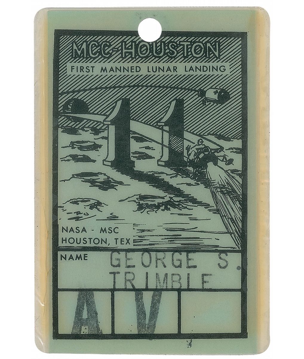 Apollo 11 MOCR (Mission Operations Control Room) badge. Laminated light green badge, issued to Deputy Director of the Manned Spacecraft Center George S. Trimble, measures 2.5 x 3.75, and has an attractive illustrated background of the lunar lander and command module. In fine condition, with punch hole to top edge and some light toning.
