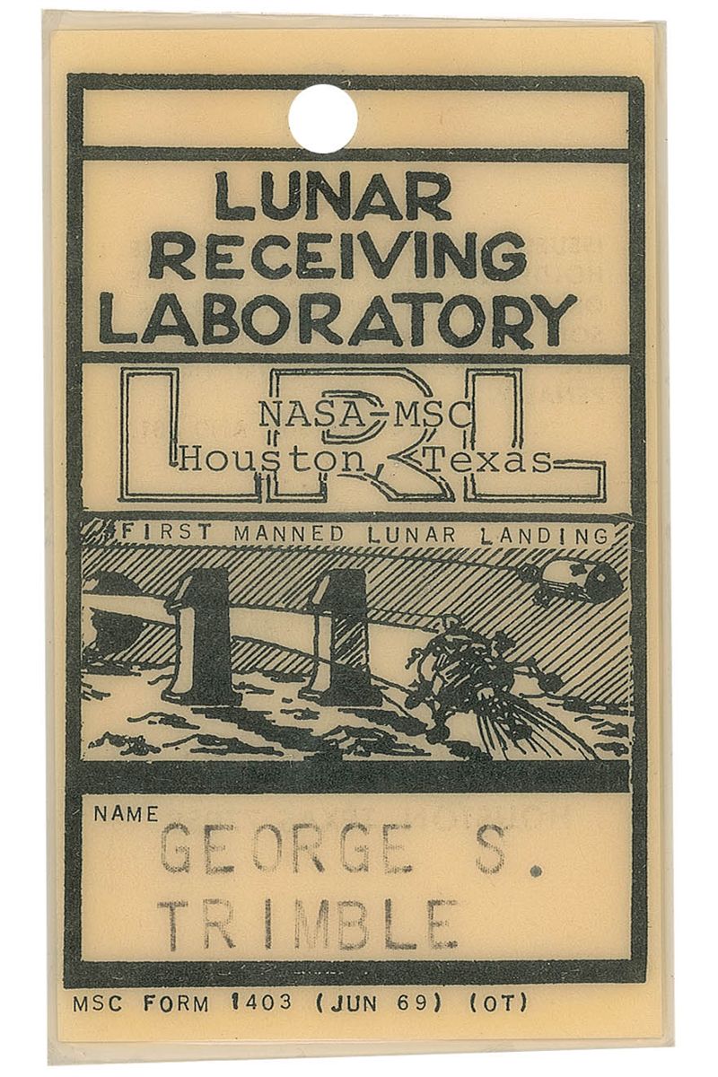 Scarce Apollo 11 Lunar Receiving Laboratory badge. Laminated light yellow badge, issued to Deputy Director of the Manned Spacecraft Center George S. Trimble, measures 2.25 x 3.75, with an attractive illustrated background of the lunar lander and command module. In fine condition, with a punch hole to top edge. Badges for the Lunar Receiving Laboratory are quite rare.