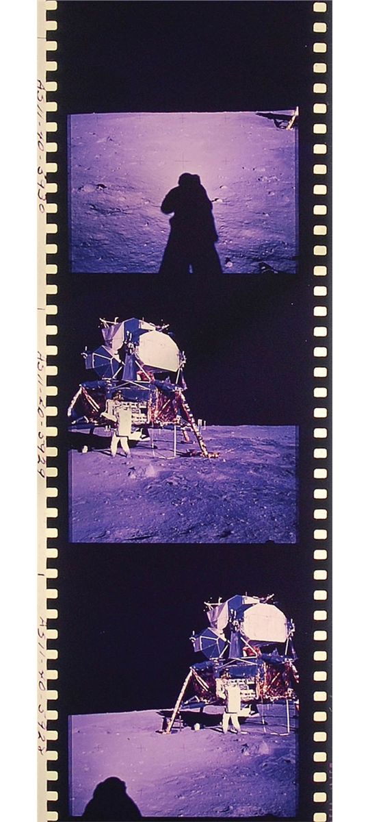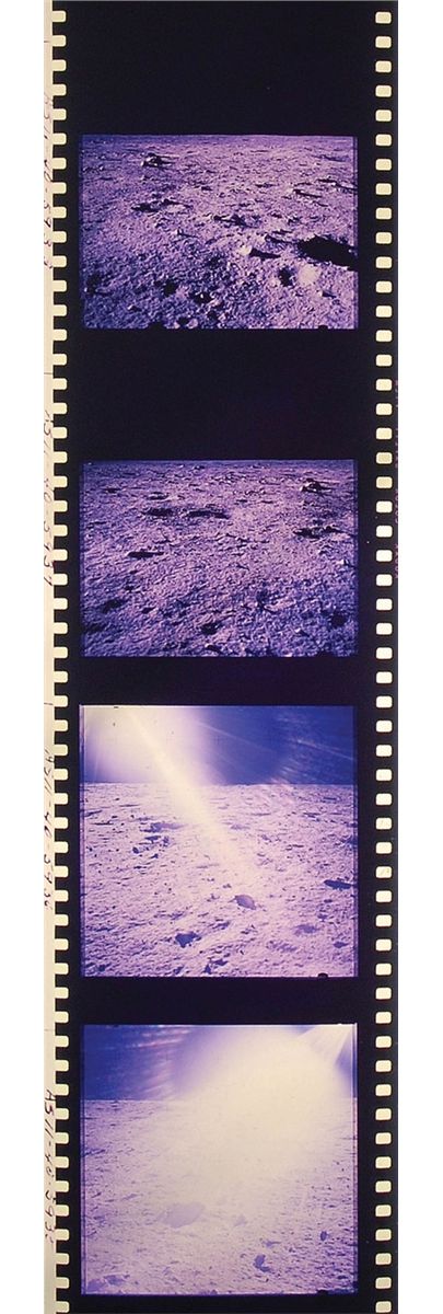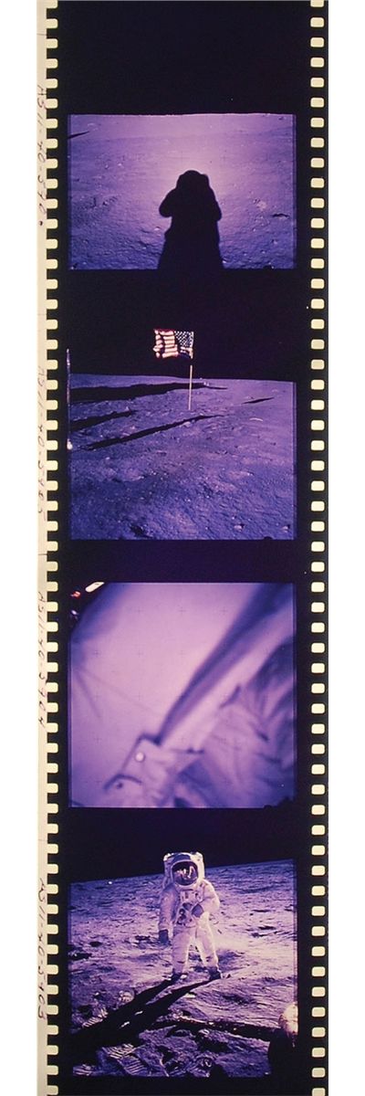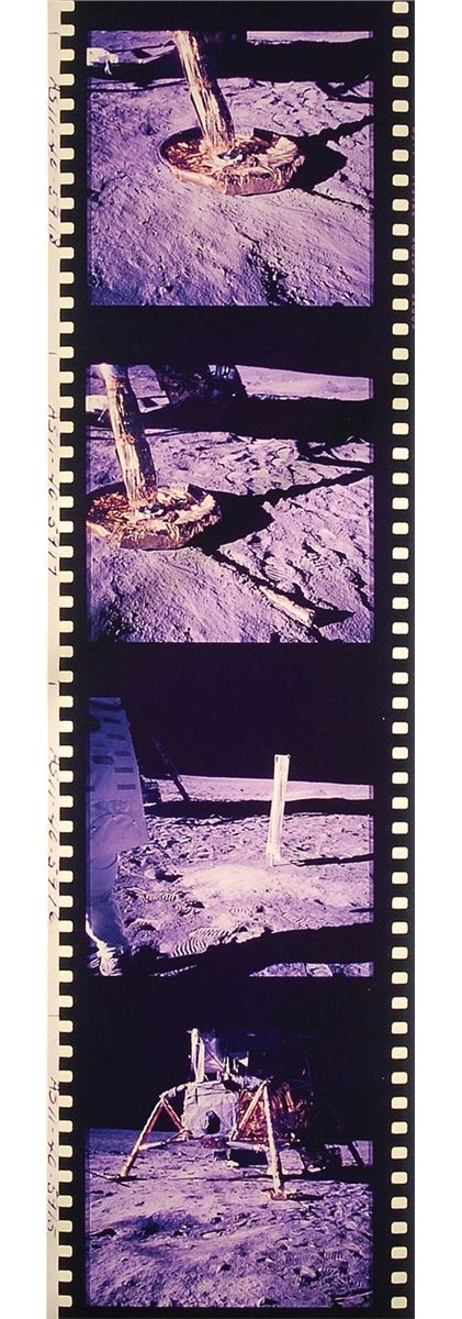 Amazing and extremely rare complete roll of 70mm color film transparencies from the famous Apollo 11 Hasselblad Magazine S, shot by Neil Armstrong. Roll is labeled at the beginning “Heads; Mag S, Apollo 11,” and photos are labeled “AS11-40-5844,” up to “5970.” Spectacular images of the lunar surface from inside and outside the capsule as well as triumphant images from humanity’s first ever moonwalk. Magazine S produced arguable some of the most memorable and reprinted images from the entire Apollo program, including the iconic Buzz Aldrin "visor," American flag, descent from the lunar module, and lunar boot-print images. This is either a second or third generation print from the original roll. In fine condition, with some scattered staining along the roll to most of the images, but not affecting the overall visual appearance. Provenance: Superior Galleries, May 2001.