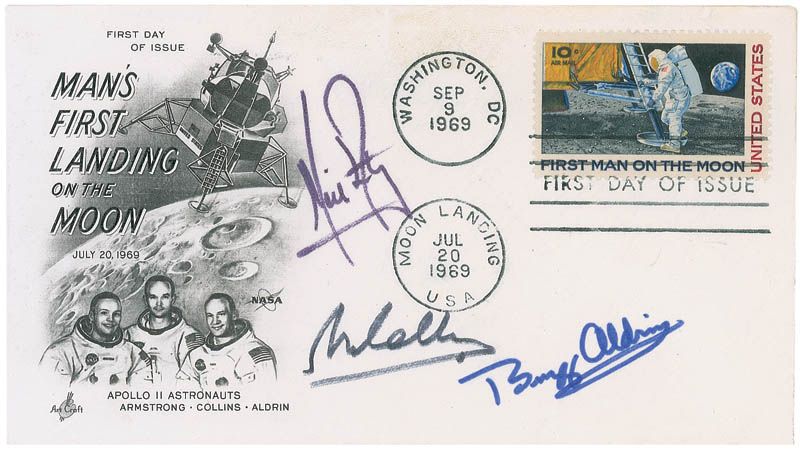 Scarce FDC honoring man’s first landing on the moon, signed in black felt tip by Neil Armstrong and Michael Collins, and in blue felt tip by Buzz Aldrin. In fine condition, with a bit of trivial toning along top edge. Uncommon in this form as the Apollo 11 crew have long refused to sign any type of covers.