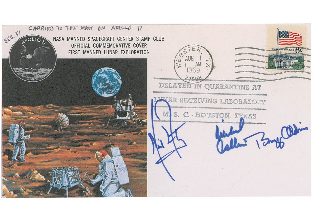 Extremely rare flown Apollo 11 postal cover, from Buzz Aldrin’s personal collection, bearing a color cachet honoring the first manned lunar expedition, postmarked August 11, Webster, Texas, and clearly stamped, "Delayed in quarantine at Lunar Receiving Laboratory M.S.C.-Houston, Texas.” Signed in blue felt tip by Neil Armstrong, Michael Collins, and Buzz Aldrin. Cover is also notated at the top in black ballpoint by Aldrin “EEA 51, Carried to the Moon on Apollo 11.” Although the crew splashed down July 24, 1969, they and their equipment and belongings were immediately quarantined until August 11, when the covers were able to be postmarked at the Webster, Texas, Post Office. In very fine condition. A superb example, these covers are seldom seen where part of Armstrong's signature is not obscured by the color cachet. These covers represent the pinnacle for any collection of space-related covers.