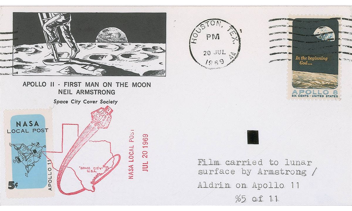 A limited edition presentation of a small section of flown film, approximately .25 x .25, carried to the lunar surface by Neil Armstrong, #5/11, affixed to a commemorative cover bearing a cachet honoring Apollo 11 and Neil Armstrong by the Space City Cover Society. Cover also bears a July 20, 1969, Houston, Texas, postmark. In fine condition.