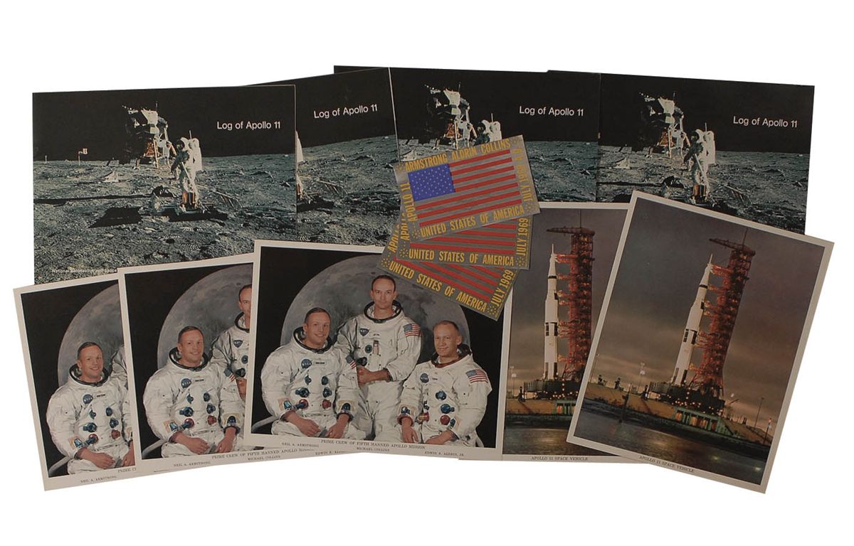 Twelve unsigned items: three color 10 x 8 NASA photos of the crew posing in their white spacesuits; two color 8 x 10 NASA photos of the Apollo 11 space vehicle; four booklets released by NASA entitled Log of Apollo 11, 10.25 x 7.5, 11 pages, featuring a timeline and images from the flight; and three shiny Apollo 11 bumper stickers, 5 x 3, depicting an American Flag. In overall fine condition.