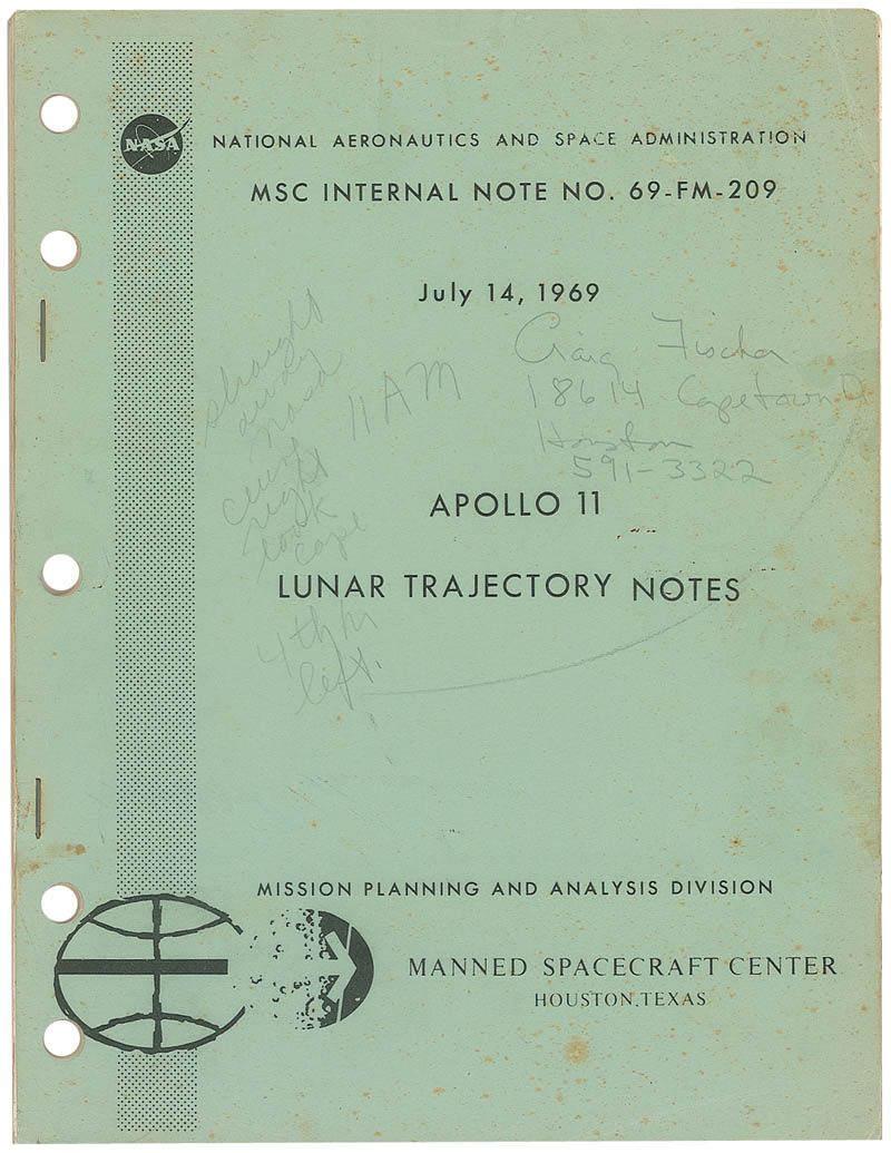 A printed Apollo 11 Lunar Trajectory Notes manual, dated July 14, 1969, 8 x 10.5, 167 pages, bound by two staples on the left edge. Foreword states this document “is to provide the layman with some general information about the design of lunar trajectories and some specific information about the Apollo 11 mission." Manual provides information on Launch and Translunar Ejection, Lunar Module Descent and Landing, LM Lift-Off, and Emergency Return to Earth. In very good condition, with pencil notations and foxing to front cover, dampstaining to back cover, and expected handling wear.