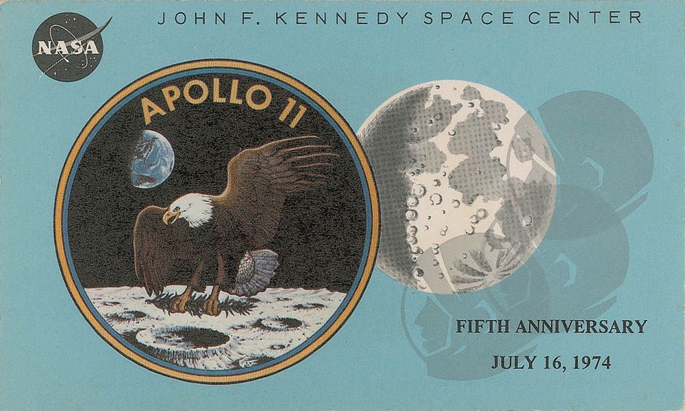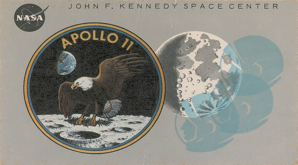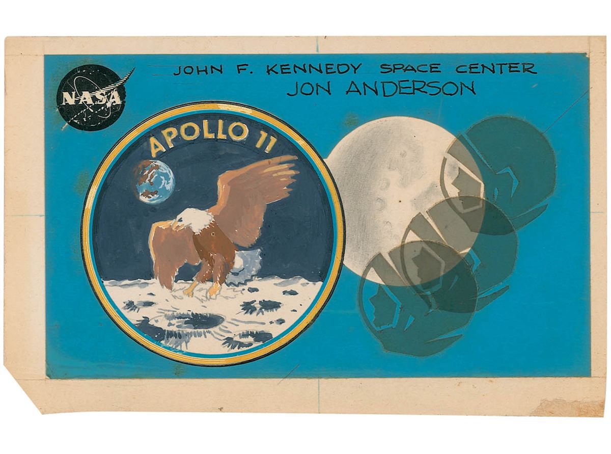 Amazing and one-of-a-kind original badge artwork for the Apollo 11 main VIP-issued launch viewing site badges saved from the Kennedy Space Center graphic design offices. Artwork is done in pencil, ink, and paint on a 5.5 x 3.5 off-white piece of heavy cardstock, and depicts the Apollo 11 emblem, silhouettes of three astronauts, and the moon. In fine condition, with some scattered light soiling and creasing. Accompanied by two vintage NASA issued badges, one is light gray and is numbered 1465 and was issued for the actual launch; the second is light blue and issued for the 5th anniversary of the launch, allowing access to Launch Complex 39. A unique artifact from the most coveted of Apollo missions.