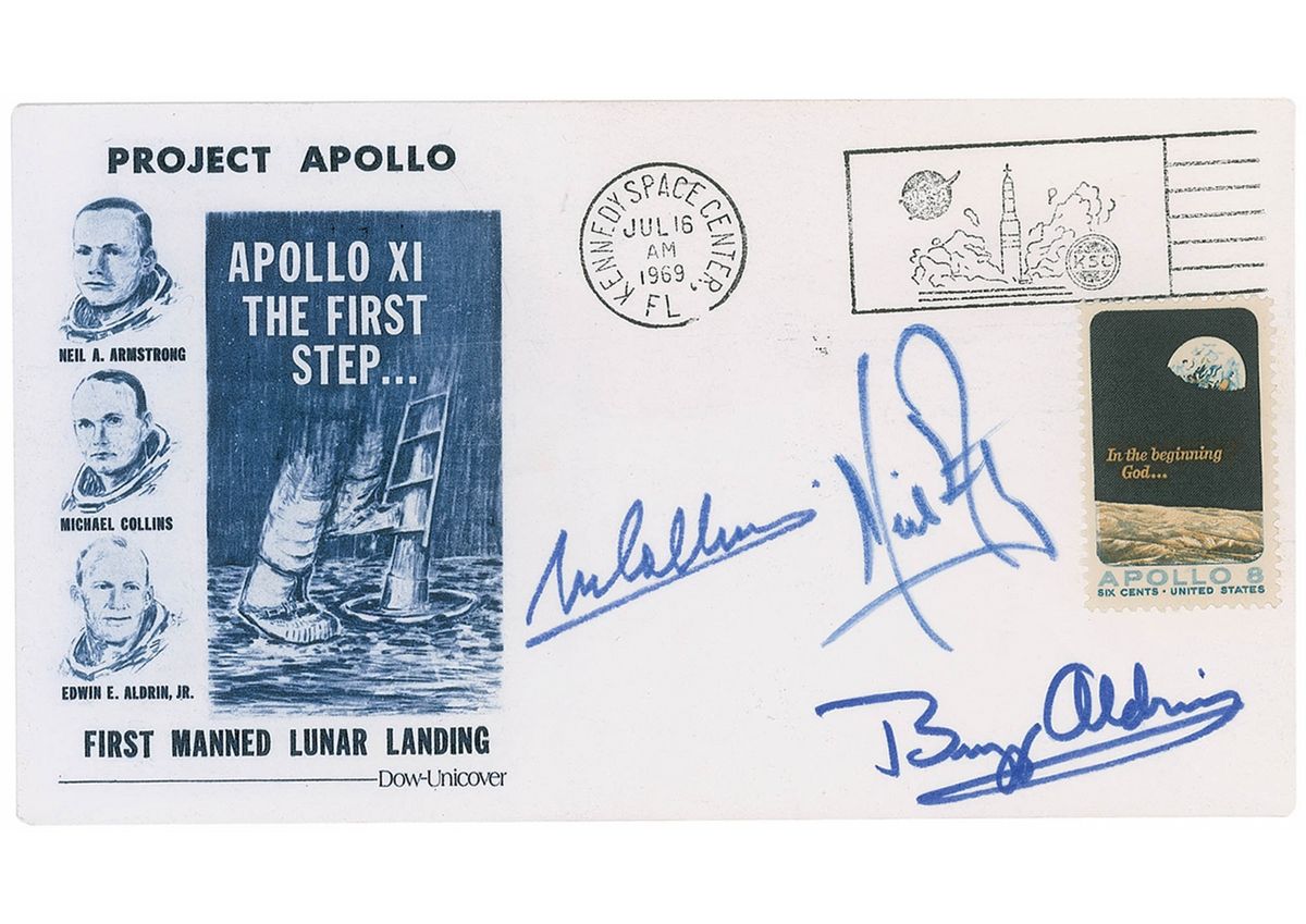 Apollo 11 ‘Type 2’ insurance cover, 6.5 x 3.5, honoring of the three crew members and the first step on the moon, bearing a July 16, 1969, Kennedy Space Center cancellation, signed in blue felt tip by Neil Armstrong, Buzz Aldrin, and Michael Collins. In fine condition.