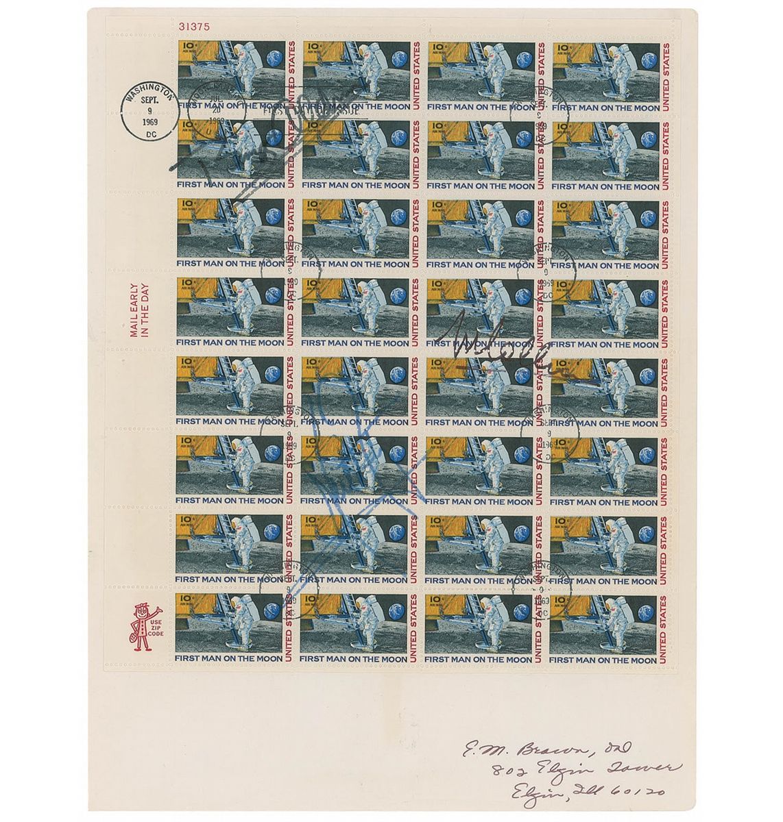 Complete block of 32 USPS 10-cent First Man on the Moon stamps, 9 x 10, signed in blue felt tip by Neil Armstrong and in black felt tip by Buzz Aldrin and Michael Collins. Sheet bears several September 9, 1969, Washington, D. C., postal cancellations and is affixed to a 9.5 x 12.5 off-white sheet. Light to moderate contrast to signatures, otherwise fine condition.