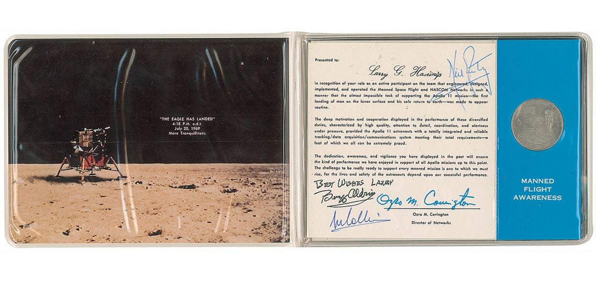 Apollo 11 Manned Flight Awareness medal, 1.25? diameter. The face bears the raised re-creation of the famous image of Buzz Aldrin looking at the American flag on the lunar surface; the reverse is engraved, “This Medallion contains metal from spacecrafts C