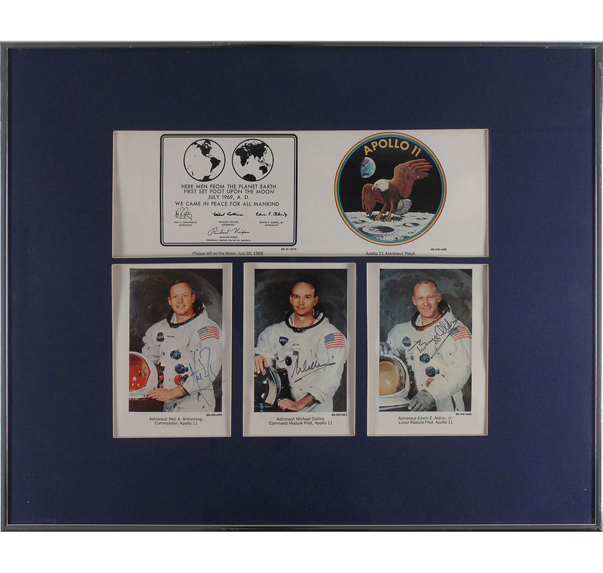 Color 12.5 x 10 composite book photo featuring individual images of all three crew members in their white space suits, signed in blue felt tip by Neil Armstrong and in black felt tip by Michael Collins and Buzz Aldrin. Matted and framed to an overall size of 20.25 x 16.25. In fine condition.