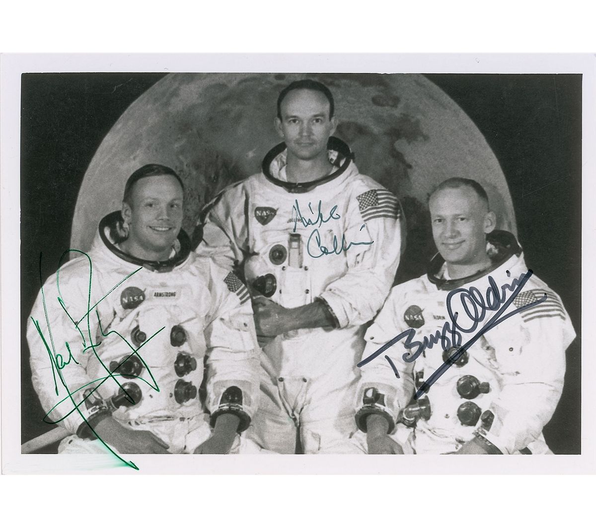 Glossy 5.75 x 4 photo of the Apollo 11 crew posing in their white space suits against a lunar background, signed in green ink by Neil Armstrong and black ink by Michael Collins and Buzz Aldrin. In fine condition, with a trivial brush to the bottom of Armstrong’s signature. A nice uninscribed example.