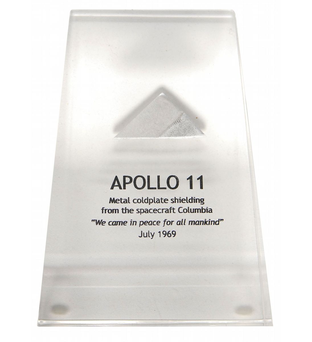 Flown piece of coldplate metal used to shield the Apollo 11 Command Module Columbia as it carried the crew to and from the moon. The triangular-shaped fragment measures approximately 1.25 x .75 and is encased in a 3.5 x 5 x 1.5 block of Lucite imprinted with the mission name and an identifying notation. In fine condition. Presentation comes in its original box with a certificate from Historic Space.