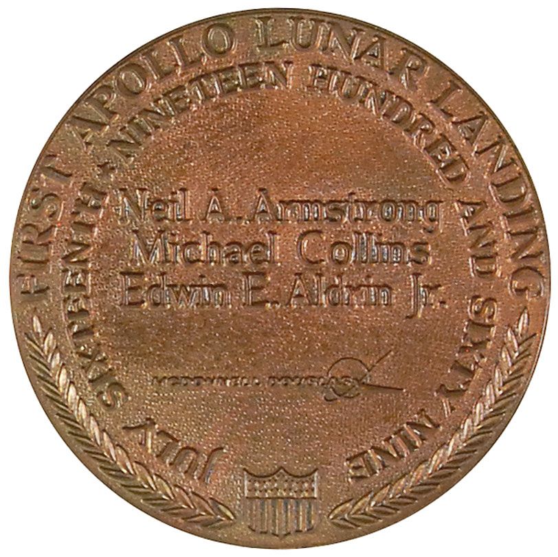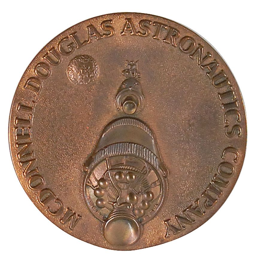 Apollo 11 Copper McDonnell Douglas contractor medallion. The 2? diameter medal bears a raised rendition of the Apollo II spacecraft and the name "McDonnell Douglas Astronautics Company,” around the edge. The reverse bears the date of the mission, the names of the crew, and the McDonnell Douglas logo. In fine condition.