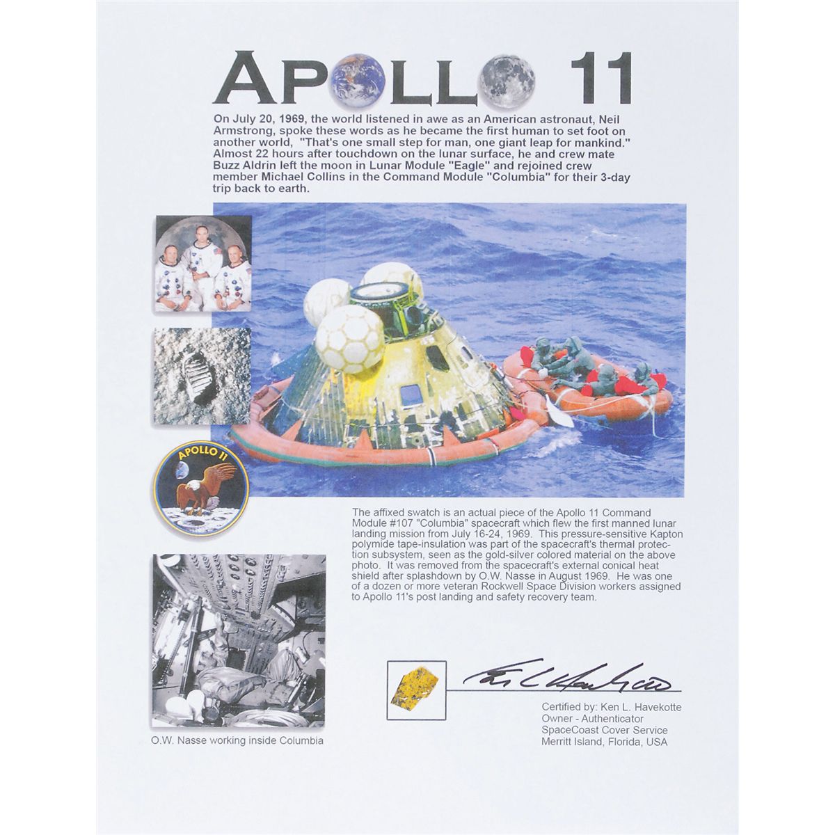 A .5 x .5 swatch of Kapton foil removed from the Apollo 11 Command Module Columbia’s thermal protection subsystem, removed after splashdown by O. W. Nasse, who was assigned to the Apollo 11 post landing and safety recovery team. Piece is affixed to an 8.5 x 11 informational letter of authenticity from Ken Havekotte.