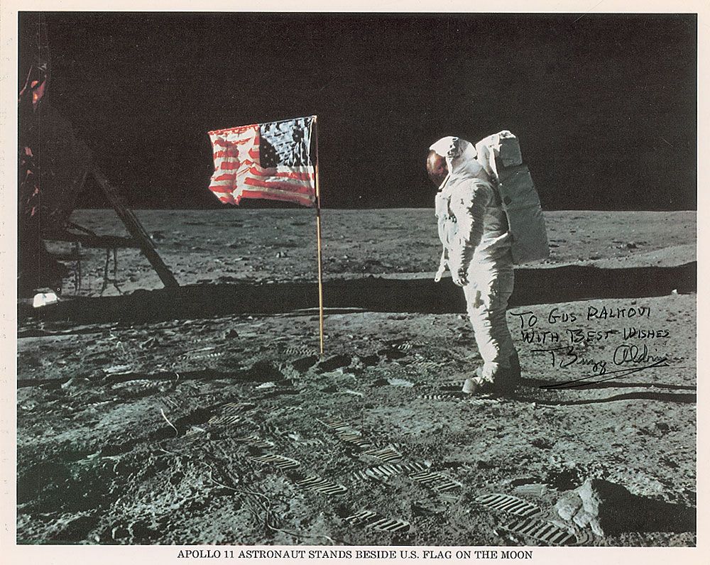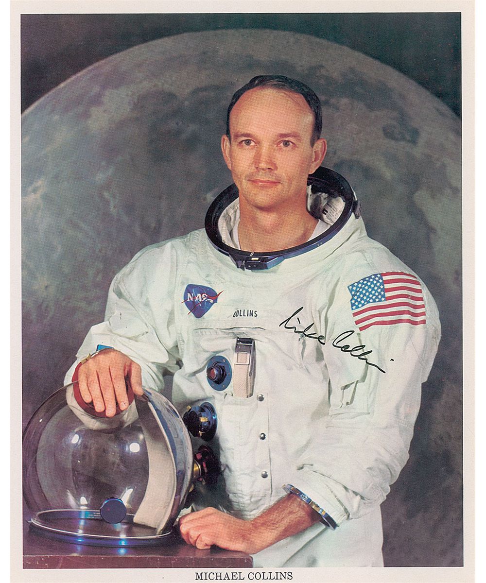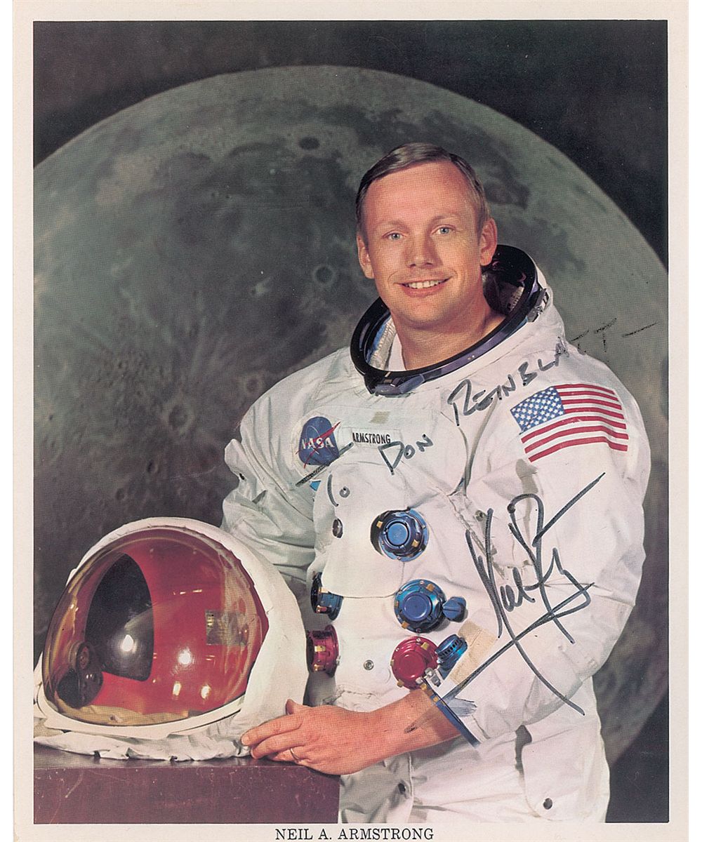Three official color NASA lithos: an 8 x 10 portrait of Neil Armstrong posing in his white space suit, his helmet by his side, signed and inscribed in black felt tip, “To Don Reinblatt—Neil Armstrong”; a 10 x 8 of Buzz Aldrin facing the American flag on the lunar surface, signed and inscribed in black felt tip, “To Gus Palkoui, with best wishes, Buzz Aldrin”; and an 8 x 10 portrait of Michael Collins posing in his white space suit, signed in black felt tip. In fine overall condition. A very presentable set of portraits of the most sought-after of the Apollo crews.