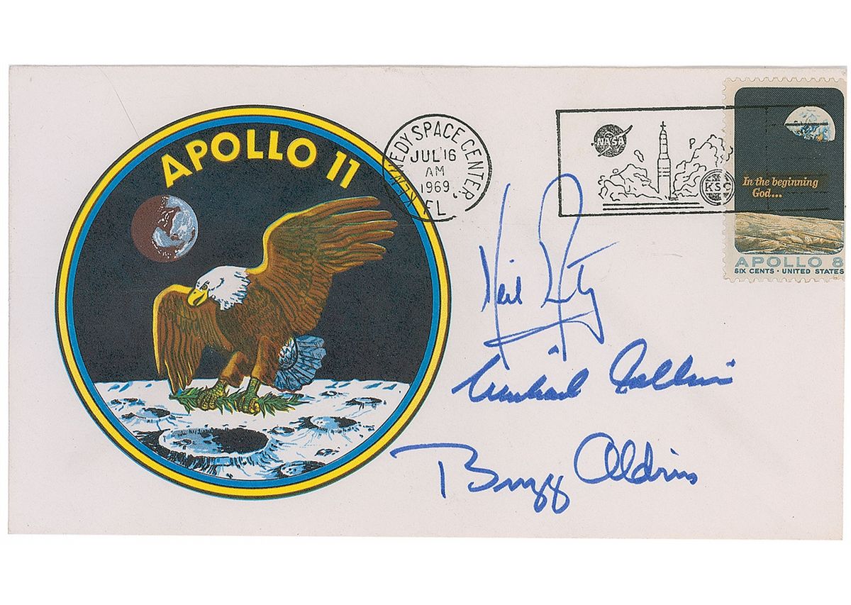 Apollo 11 'Type 3' insurance cover with a cachet of the mission insignia, bearing a July 16, 1969, Kennedy Space Center cancellation, signed in blue felt tip by Neil Armstrong, Buzz Aldrin, and Michael Collins. In very fine condition. Accompanied by a printed informational sheet stating the cover comes from the Buzz Aldrin Family collection. Produced and signed just prior to space missions in order to provide financial security for astronauts’ families in case of disaster, insurance covers are the ultimate space-related philatelic item, and one of the most sought-after formats for astronaut autographs.