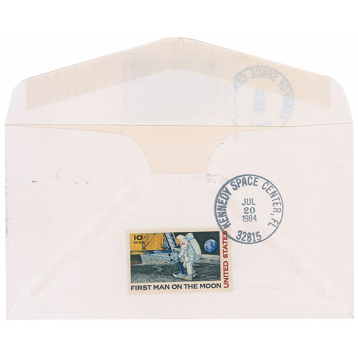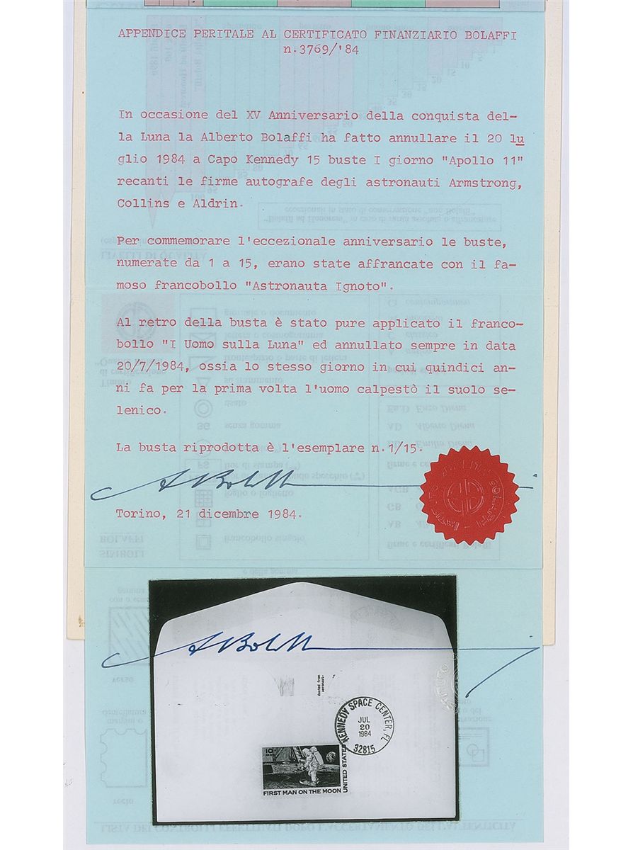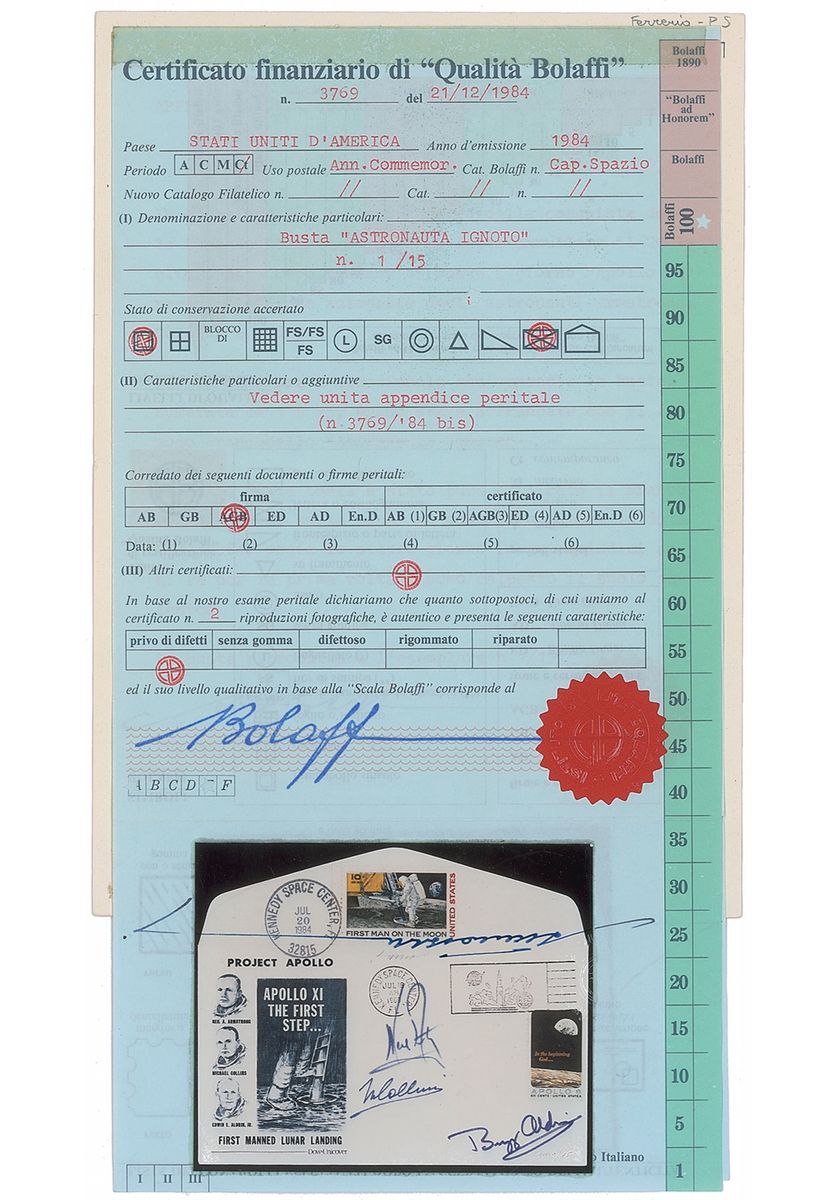 Apollo 11 ‘Type 2’ Dow-Unicover insurance cover with a cachet honoring the three crew members and the first step on the moon, signed in blue felt tip by Neil Armstrong, Buzz Aldrin, and Michael Collins. Cover also bears a small pencil notation to lower right corner and along top edge, two 10-cent first man on the moon postage stamps, and a July 20, 1984, Kennedy Space Center postal cancellation on the flap. The stamp on the flap is the rare ‘10¢ Moon Landing, rose red omitted’ stamp (Scott C76a), from which the red flag stripes on the astronaut’s arm are missing, along with the light red dots over the yellow portions of the lunar module and the astronaut’s face plate. Only fifteen insurance covers bear this erroneous stamp, making it an especially desirable example. Also accompanied by its Apollo 11 mission profile card and a certificate of authenticity from Italian philatelist Alberto Bolaffi, certifying both the cover and the stamps. In very fine condition. Signed prior to launch in order to provide financial security for astronauts’ families, insurance covers are some of the most highly sought-after space collectibles, particularly from the first moon mission.