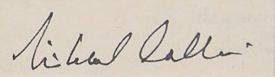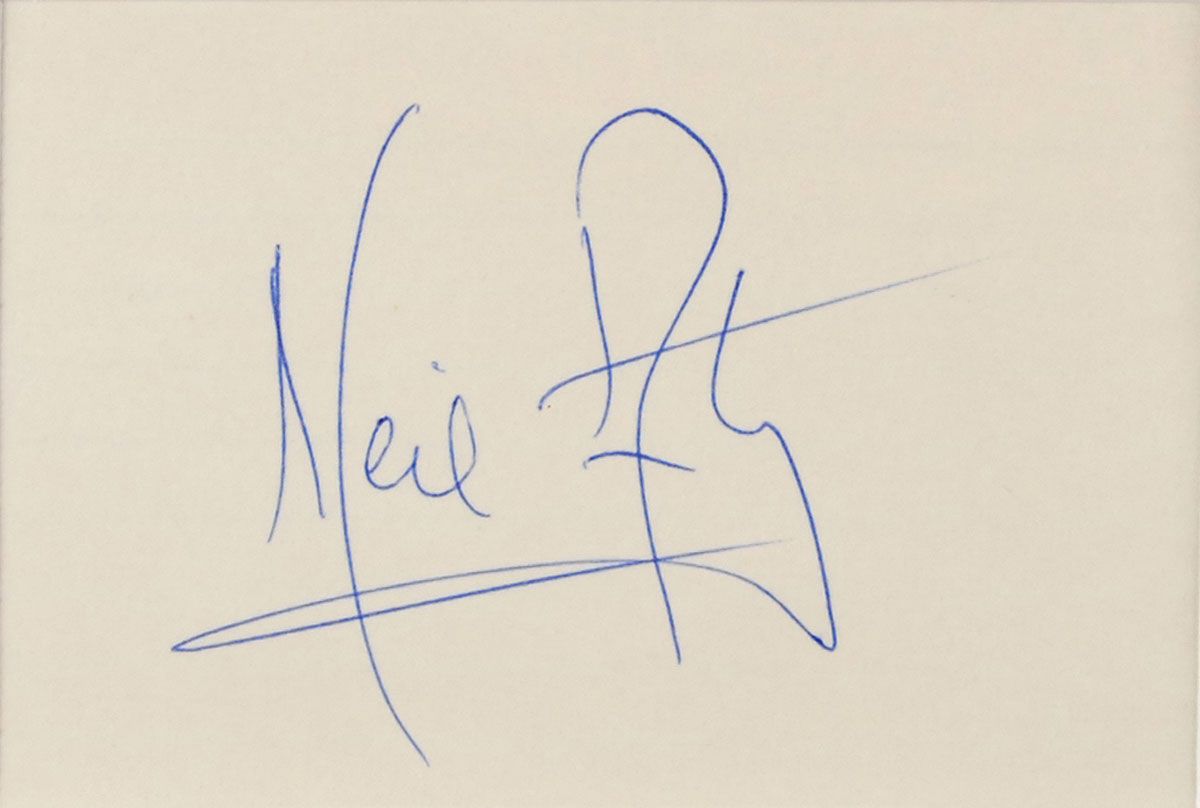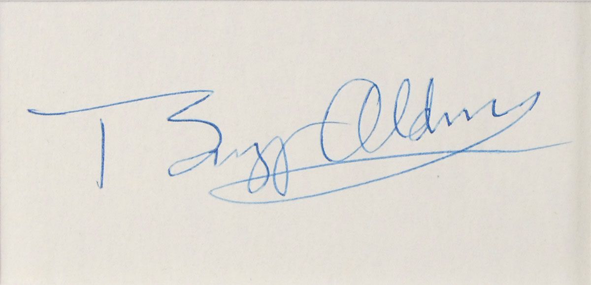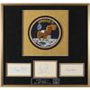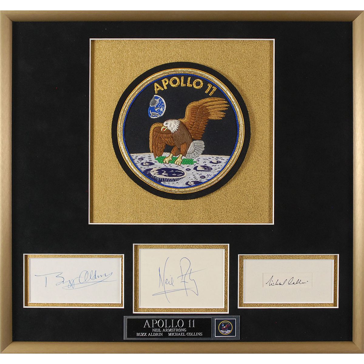 Ink and ballpoint signatures of Neil Armstrong, Buzz Aldrin, and Michael Collins on individual off-white cards or sheets, with Collins’s signature matted. All three signatures are double-matted and framed together with a large embroidered Apollo 11 mission patch and a small plaque to an overall size of 17 x 16. In fine condition.