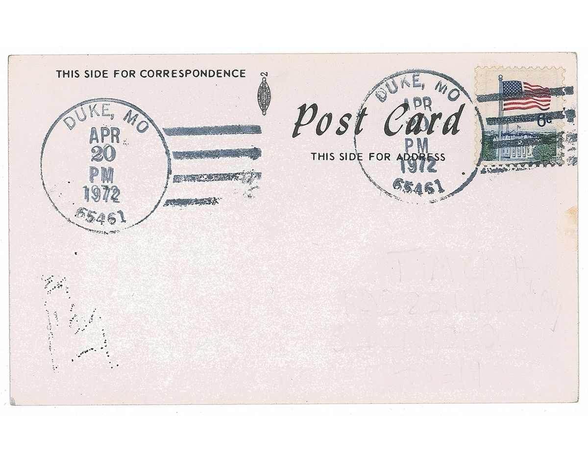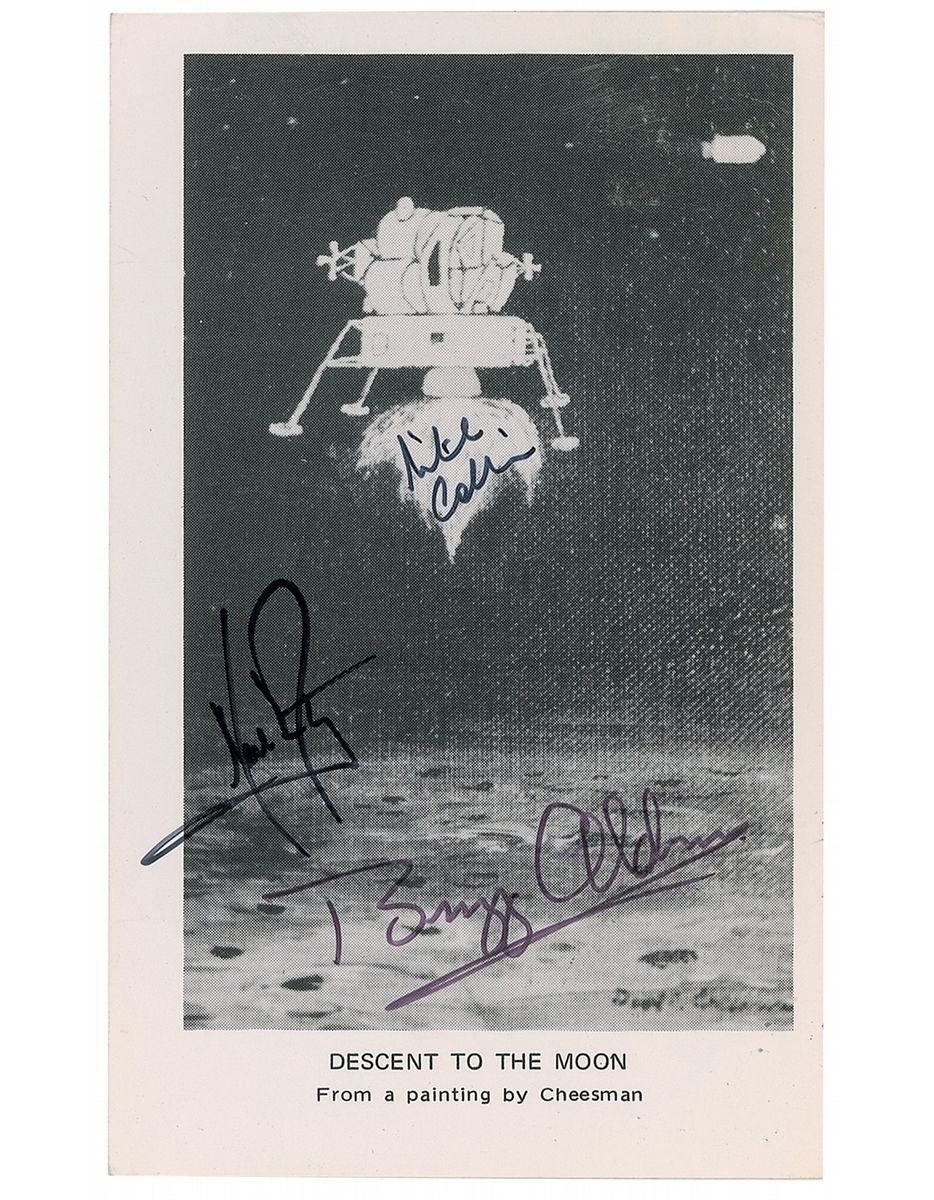 Apollo 11 postcard, 3.25 x 5.25, with a depiction of an acrylic painting by Cheesman, captioned at the bottom, “Descent to the Moon / From a painting by Cheesman,” signed on the front in black felt tip by Neil Armstrong, Buzz Aldrin, and Michael Collins. Reverse bears two April 20, 1972, Duke, Missouri, postal cancellations. In fine condition.