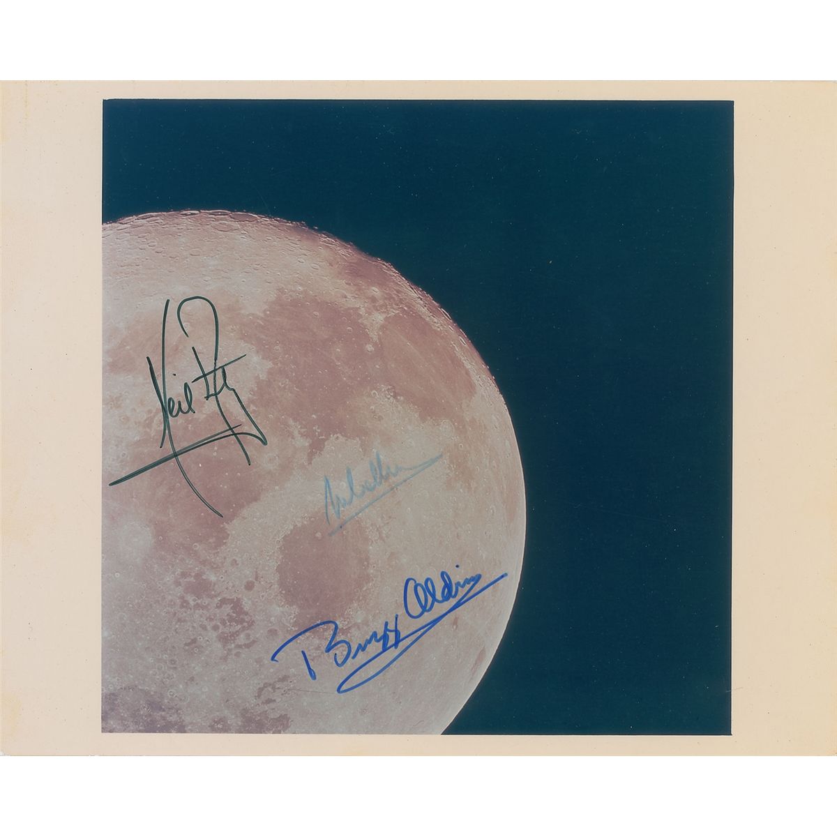 Official color glossy 10 x 8 NASA photo of the moon, signed in blue and black felt tip by Neil Armstrong, Buzz Aldrin, and Michael Collins. The reverse is watermarked “A Kodak Paper,” dating the photo’s production to the Apollo era. In fine condition, with a paperclip impression to the top and Collins’s signature a few shades light. An uncommon image to find signed by the entire Apollo 11 crew.