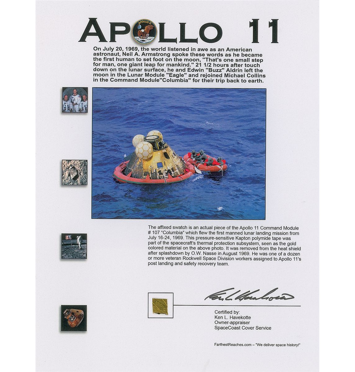 A flown .5 x .5 swatch of Kapton foil from the Apollo 11 Command Module Columbia’s thermal protection subsystem. Affixed to an 8.5 x 11 informational presentation, hand signed by Ken Havekotte, stating that it was removed after splashdown by O. W. Nasse, who was assigned to the Apollo 11 post landing and safety recovery team.