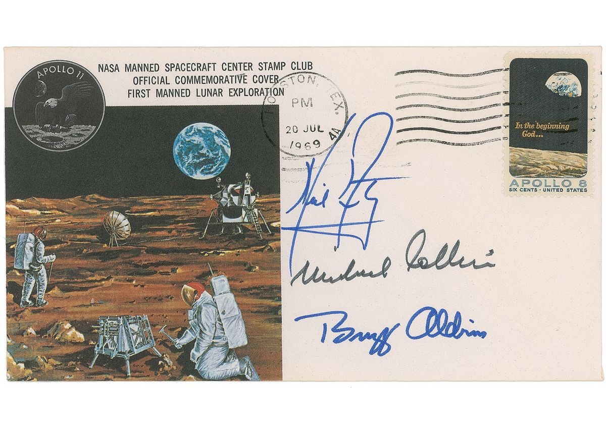 Signed Apollo 11 ‘Type 1’ insurance cover, 6.5 x 3.5, with a printed color cachet of the moon landing and a July 20, 1969, Houston, Texas, cancellation, signed in blue felt tip by Neil Armstrong and Buzz Aldrin, and in black felt tip by Michael Collins. Cover is also signed on the reverse, “This cover, from my personal collection, is for Howard Weinberger. Michael Collins, September 14, 2012.” In very fine condition. The famous insurance covers, produced immediately prior to space missions in order to provide financial security for astronauts’ families in case of disaster, have earned near-legendary status as the ultimate space-related philatelic item.