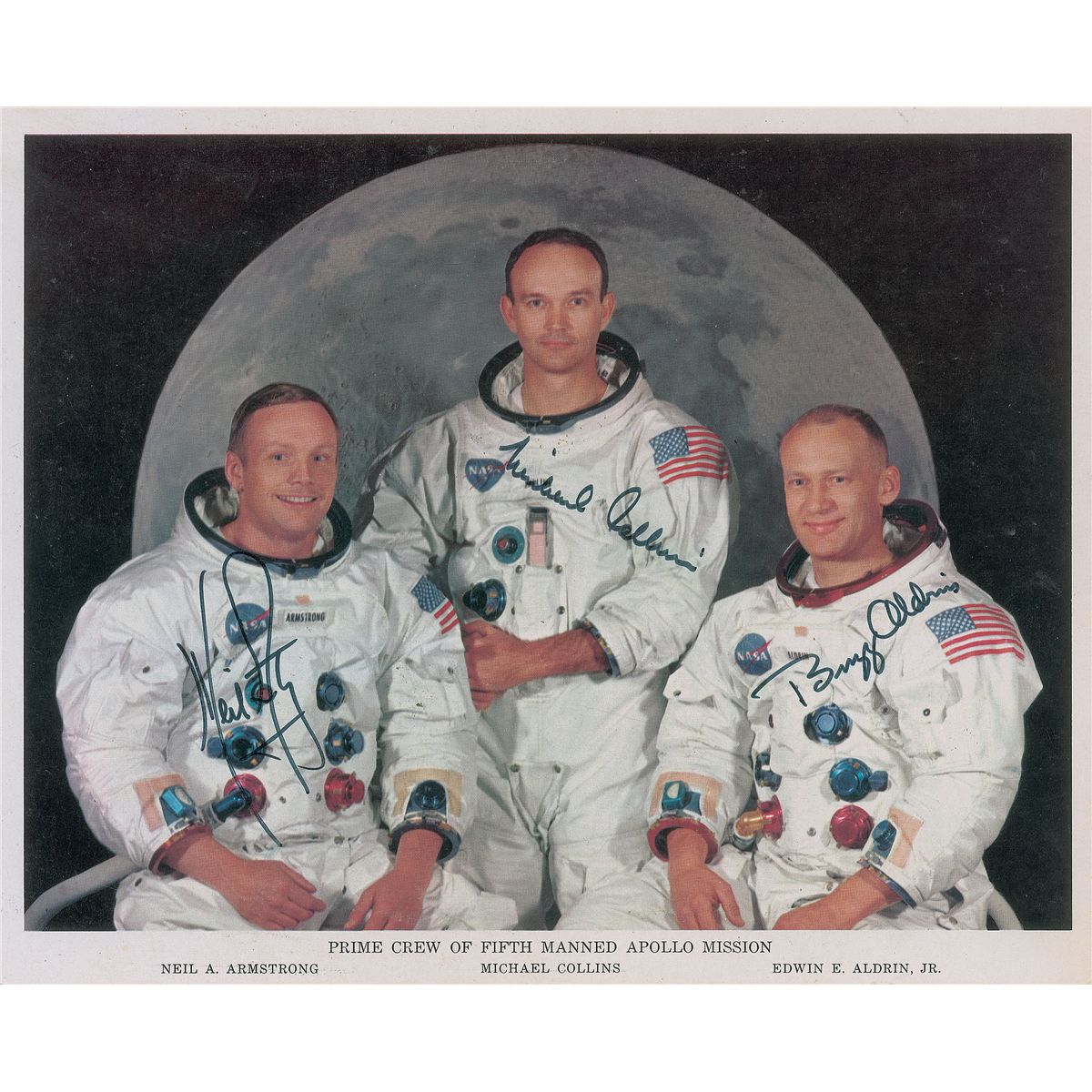 Highly coveted official uninscribed color 10 x 8 NASA lithograph of the Apollo 11 prime crew posing in their white space suits, signed in black felt tip by Neil Armstrong, Buzz Aldrin, and Michael Collins prior to their mission. In fine condition, with some slight surface loss to back of lithograph from storage in a magnetic photo album. A very nice and early example of the most historic and avidly collected Apollo mission.