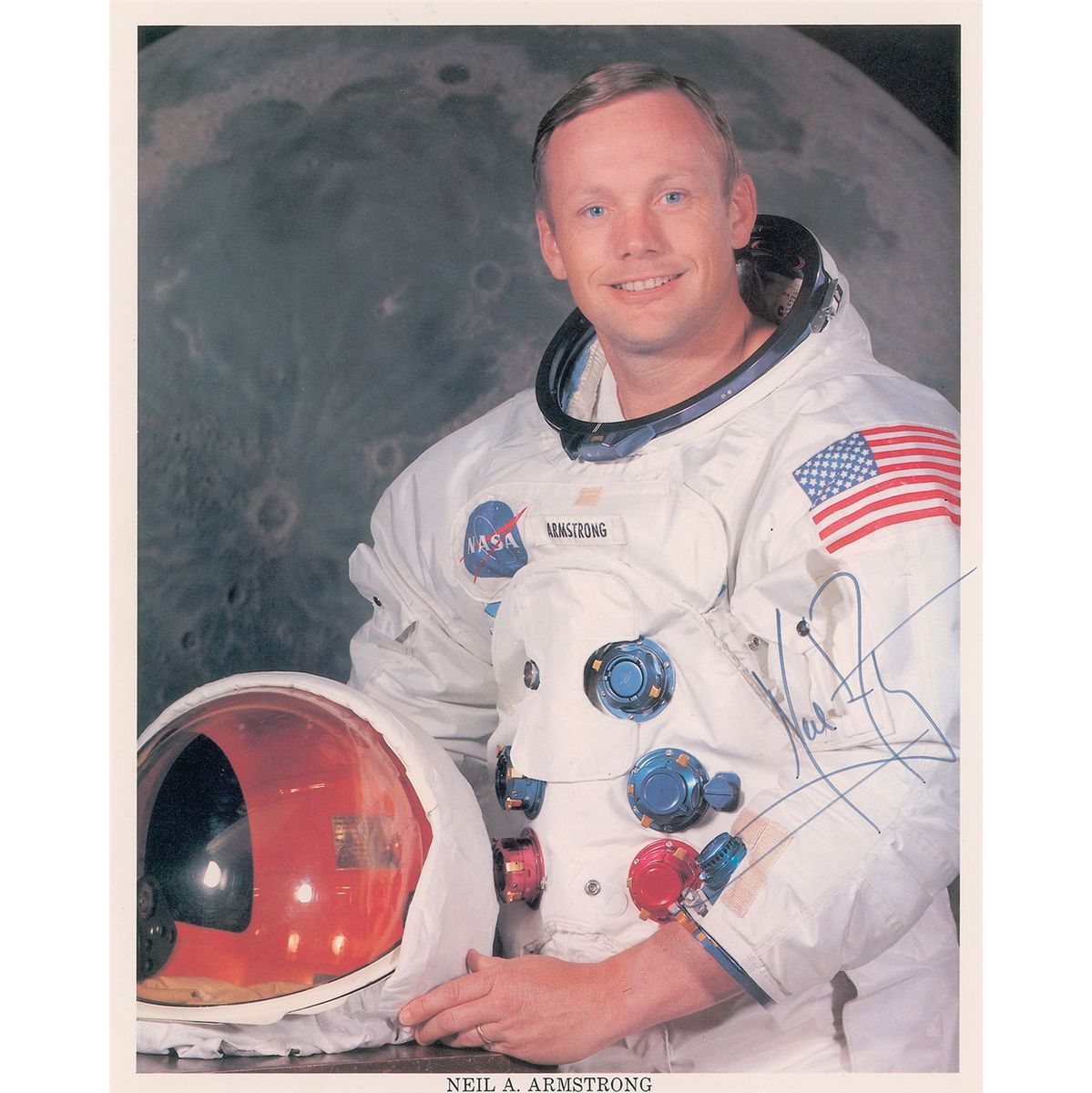 Scarce complete set of three official color 8 x 10 NASA lithographs of Neil Armstrong, Buzz Aldrin, and Michael Collins pictured individually in their white space suits, each signed in black felt tip by the astronaut pictured, with the Aldrin lithograph inscribed in another hand, “To Tommy, Best Wishes.” In overall fine condition, with a paperclip impression and creases to one corner tip of the Armstrong lithograph. Uninscribed Armstrong lithographs are highly sought after, particularly those boasting such strong signatures, and these classic portraits are infrequently offered as a full set.