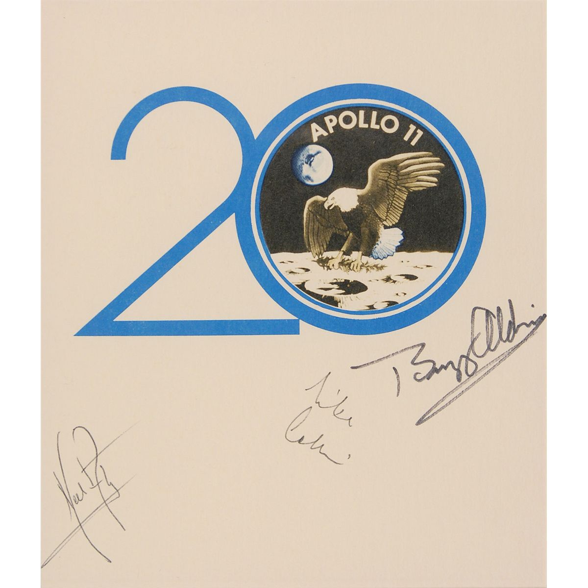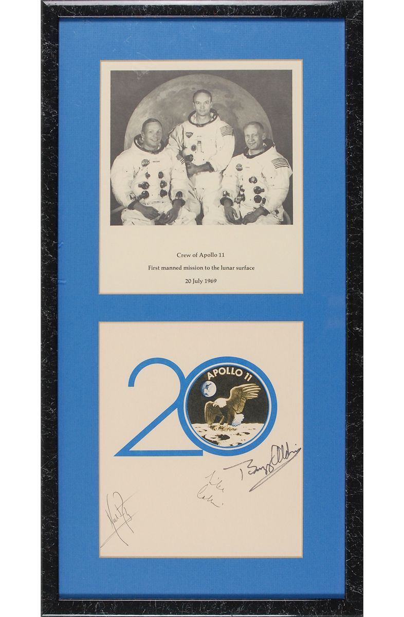 Program cover from the 20th anniversary celebration in Los Angeles of the Apollo 11 mission, 6.5 x 7.5, signed in black ballpoint by Neil Armstrong and Michael Collins and in black felt tip by Buzz Aldrin. Matted and framed with a crew portrait from the program to an overall size of 10.5 x 20. In fine condition.