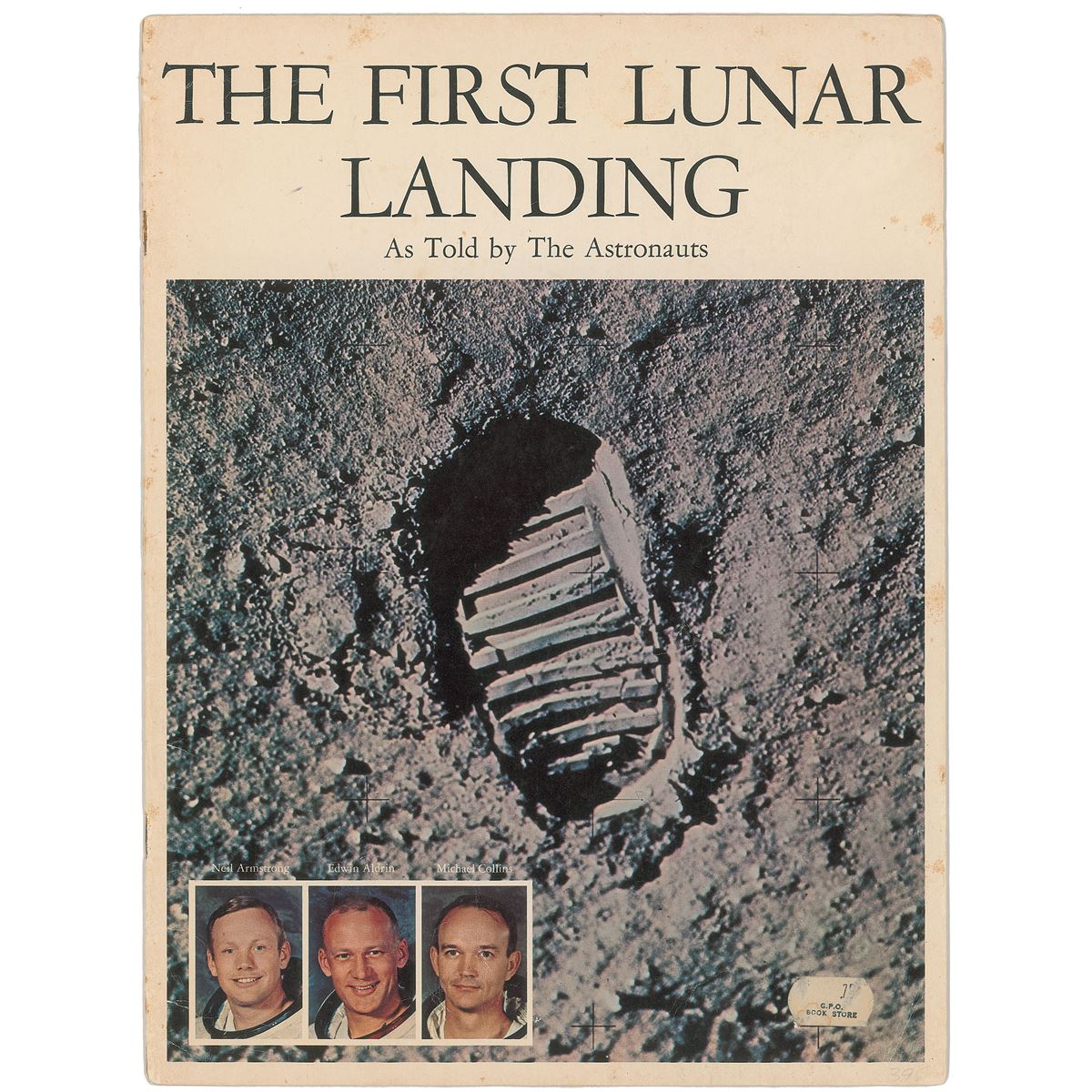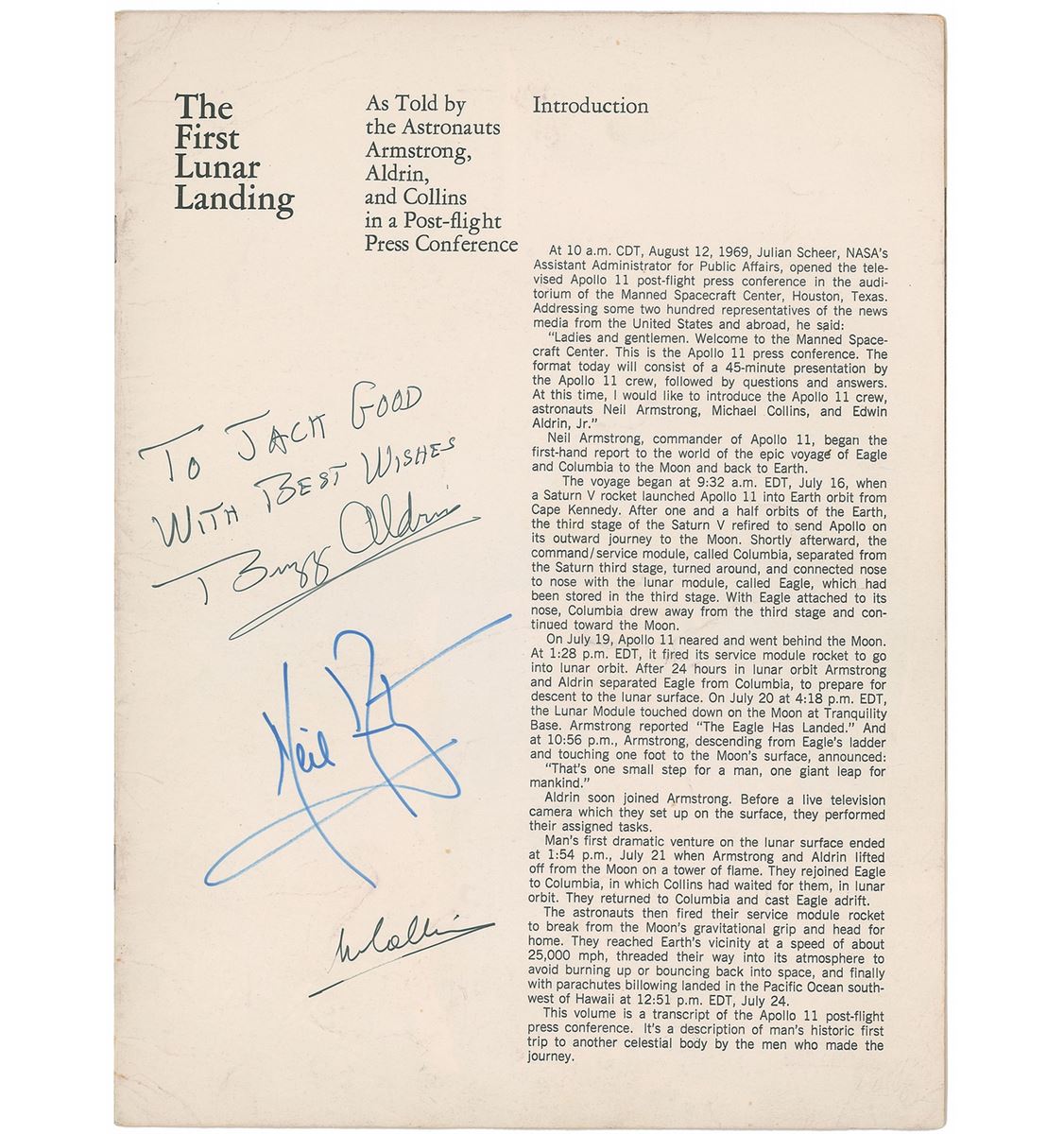 The First Lunar Landing booklet, 9 x 12, 25 pages, signed on the first page in blue felt tip by Neil Armstrong, in black felt tip by Michael Collins, and signed and inscribed in black felt tip, “To Jack Good, with best wishes, Buzz Aldrin.” In very good condition, with scattered creases and soiling mostly confined to the covers, and a pricing label affixed to the lower right corner of the front cover.