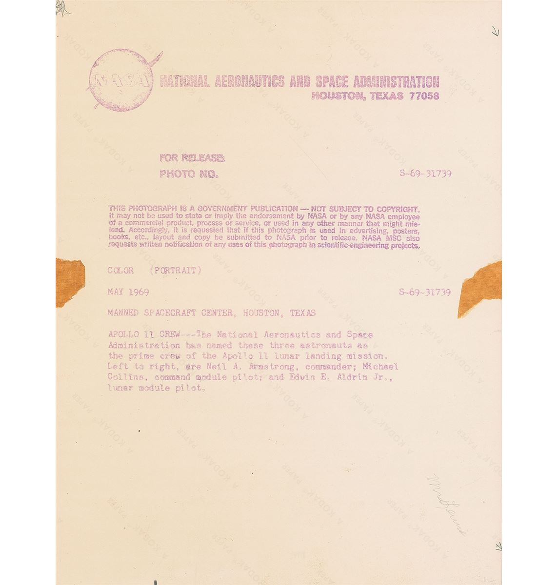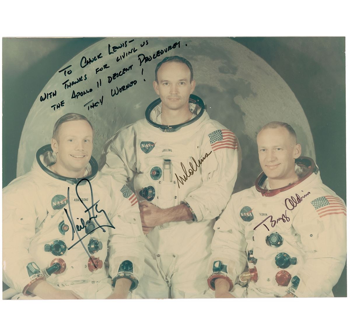 Fantastic vintage official color glossy 9.5 x 7 NASA photo of the crew in their white spacesuits, signed and inscribed during the period (circa 1969–1970) in black felt tip, “To Chuck Lewis—With thanks for giving us the Apollo 11 descent procedures. They worked! Neil Armstrong,” “Buzz Aldrin,” and “M. Collins.” Reverse bears purple NASA caption text and “A Kodak Paper” watermarks. In fine condition, with trimmed edges, the image a bit faded, and a trivial speck of surface loss to the lower left edge. An absolutely spectacular inscription on this highly sought-after vintage format.