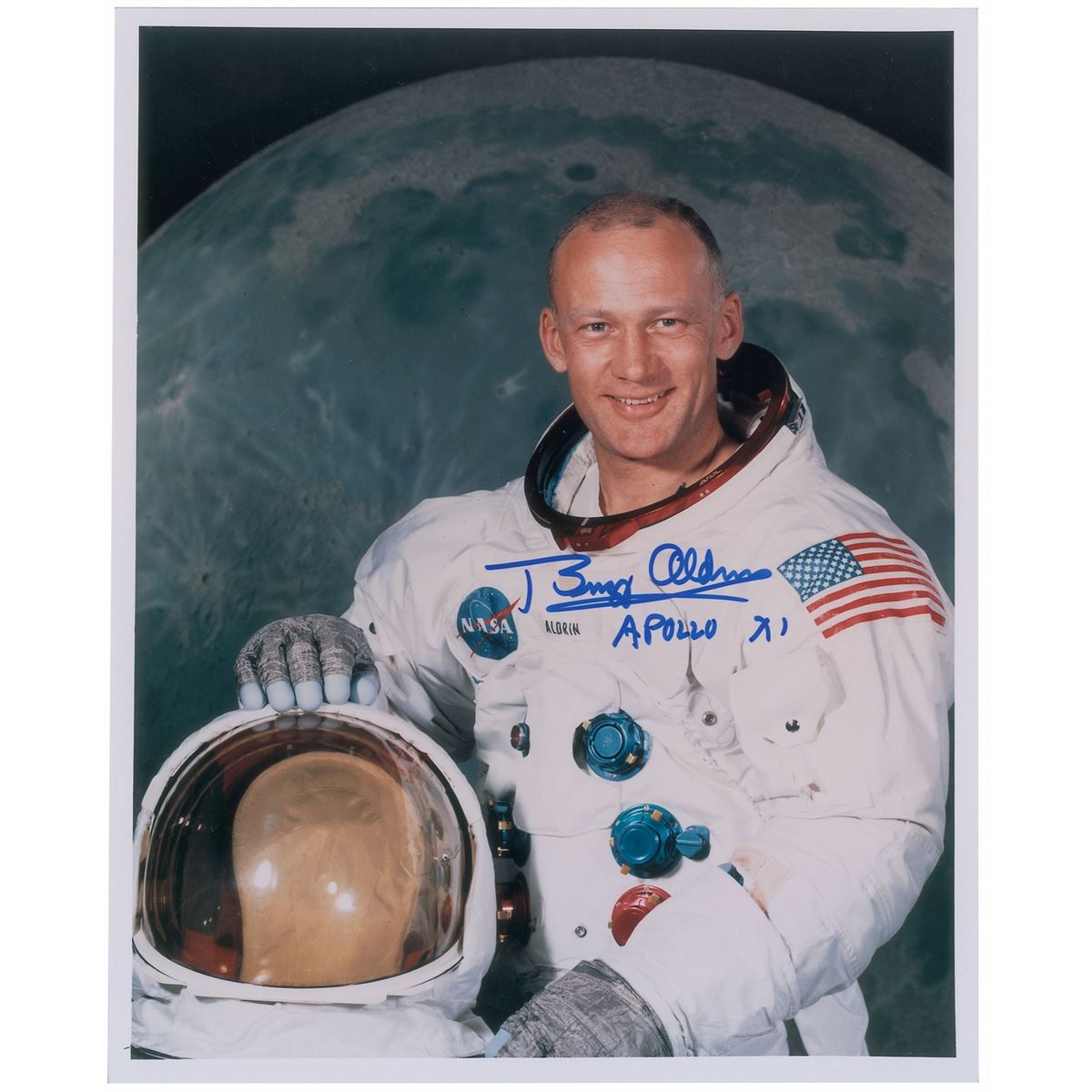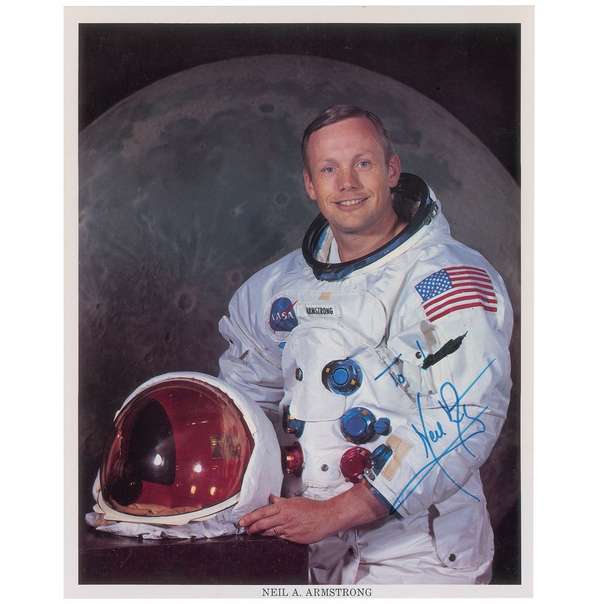 Three 8 x 10 photos: an official color NASA lithograph of Armstrong in his white space suit, signed and inscribed in blue felt tip, “To J…Neil Armstrong”; a satin-finish photo of Aldrin in his white space suit, signed in blue felt tip, “Buzz Aldrin Apollo XI”; and a satin-finish photo of Collins in his white space suit, signed in blue felt tip, “Michael Collins.” In overall very good to fine condition, with scattered creases to the Armstrong lithograph and the name in Armstrong’s inscription struck out in black felt tip.
