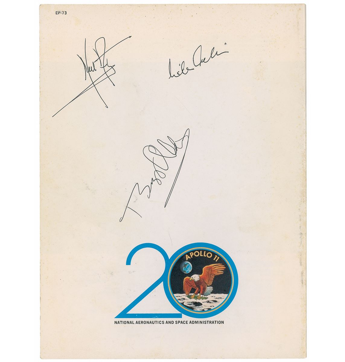 Commemorative program entitled “The First Lunar Landing: As Told by The Astronauts,” celebrating the 20th anniversary of the event, 9 x 12, 24 pages, signed on the back cover in black ink by Neil Armstrong, Buzz Aldrin, and Michael Collins. Scattered rubbing to front cover, some light toning and soiling to back cover, and slight feathering to Collins’s signature, otherwise fine condition. NASA’s Office of Public Affairs capitalized on the achievements of the successful Apollo 11 mission by releasing a commemorative program that transcribed a post-flight press conference held by Armstrong, Aldrin, and Collins.