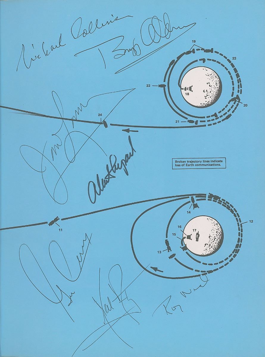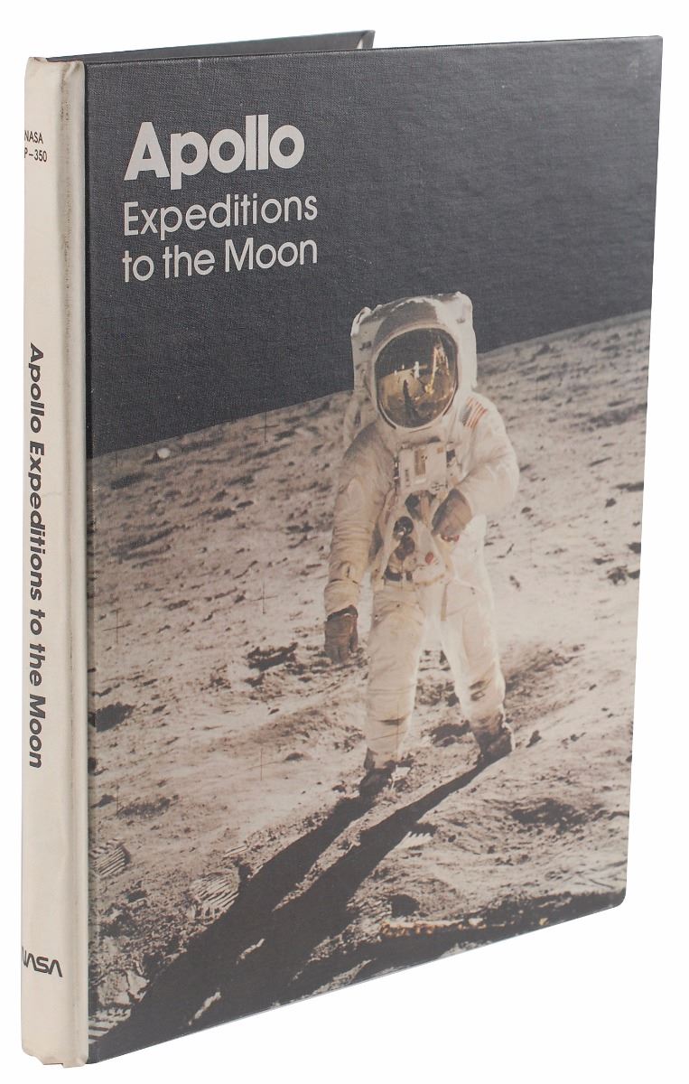 Signed book: Apollo Expeditions to the Moon. Later printing. Washington, DC: NASA, 1975. Hardcover, 9 x 12, 313 pages. Signed on the illustrated first free end page in ballpoint and felt tip by Neil Armstrong, Buzz Aldrin, Michael Collins, Alan Shepard, James Lovell, Gene Cernan, and journalist Roy Neal. In fine condition, with trivial marks and wear to spine and covers. Accompanied by a certificate of authenticity from Novaspace for the Collins signature.
