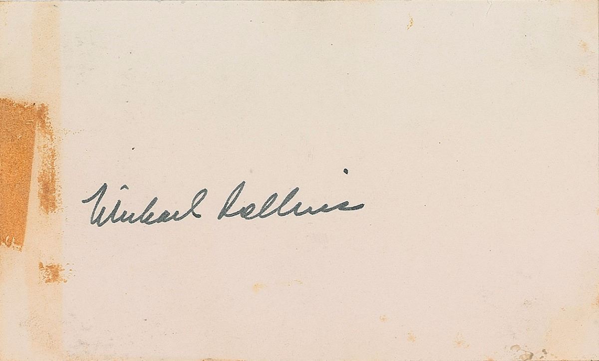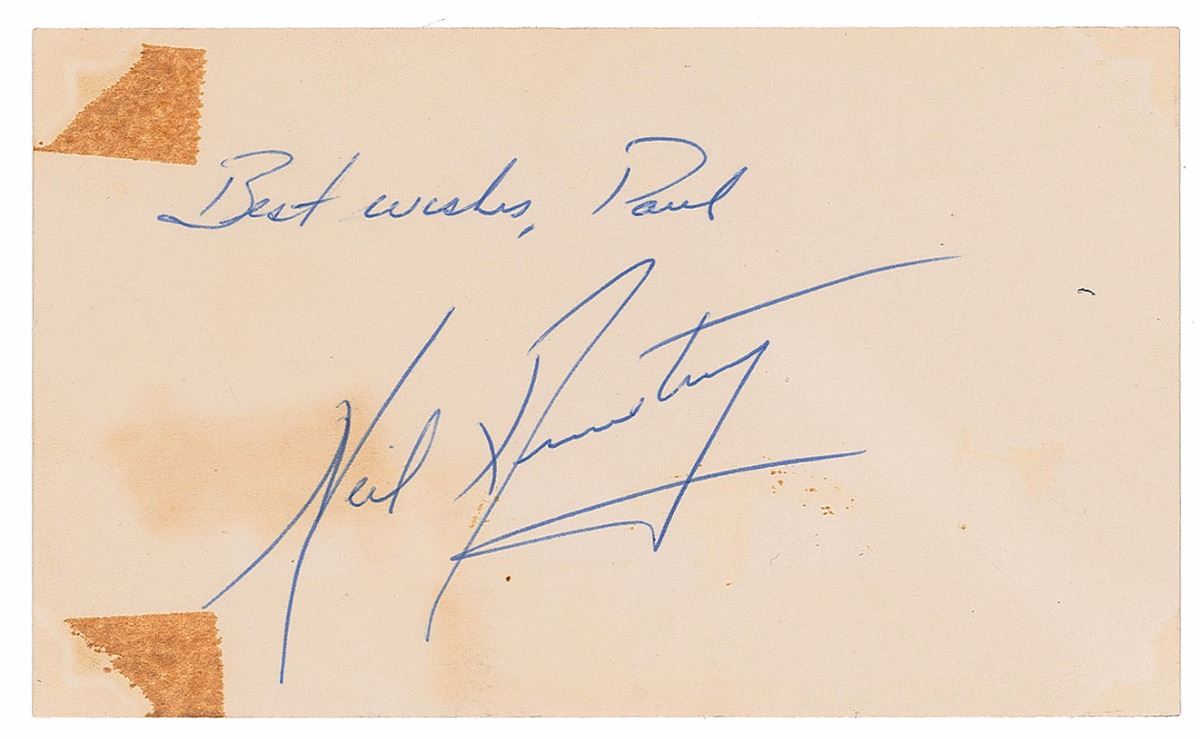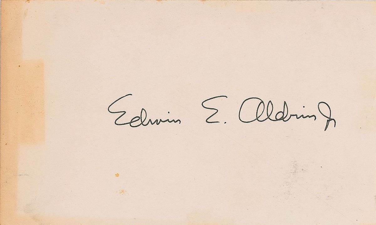 Three vintage ink signatures, “Best wishes, Paul, Neil Armstrong,” “Edwin E. Aldrin, Jr.,” and “Michael Collins,” on individual off-white 5 x 3 cards. In overall fine to very good condition, with trivial soiling, toned tape remnants and irregular blocks of toning, trivial surface loss to the reverse of the Armstrong, and two small edge tears to the Collins.