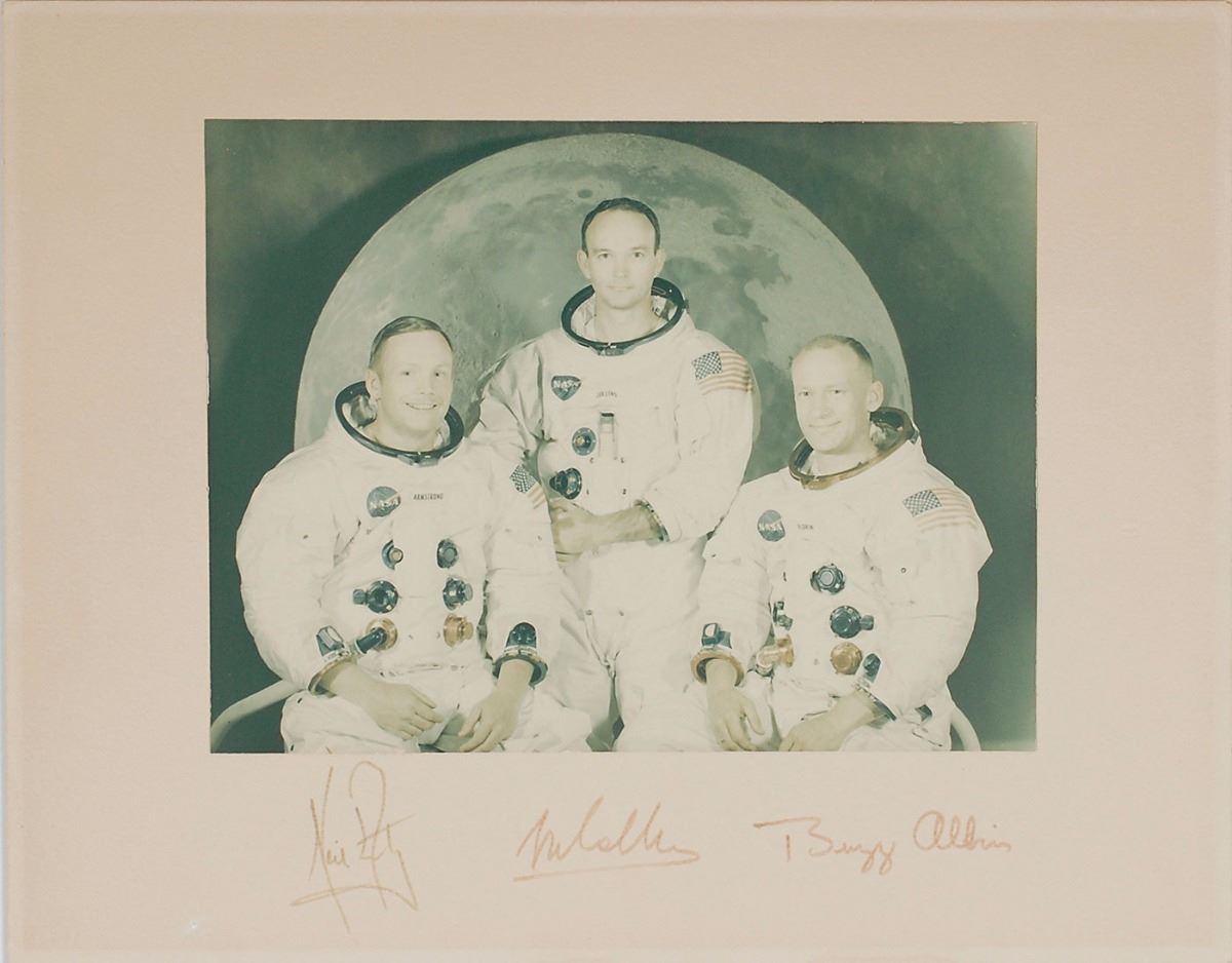 Sought-after color glossy 9.5 x 7 photo of the Apollo 11 crew in their white spacesuits against a lunar background, affixed to a 14 x 11 mount, signed on the mount in black felt tip by Neil Armstrong, Buzz Aldrin, and Michael Collins. Uniform fading to image and signatures, and a few trivial dings to mount, otherwise fine condition. An iconic image highly desirable in this oversized format, especially as it is uninscribed.