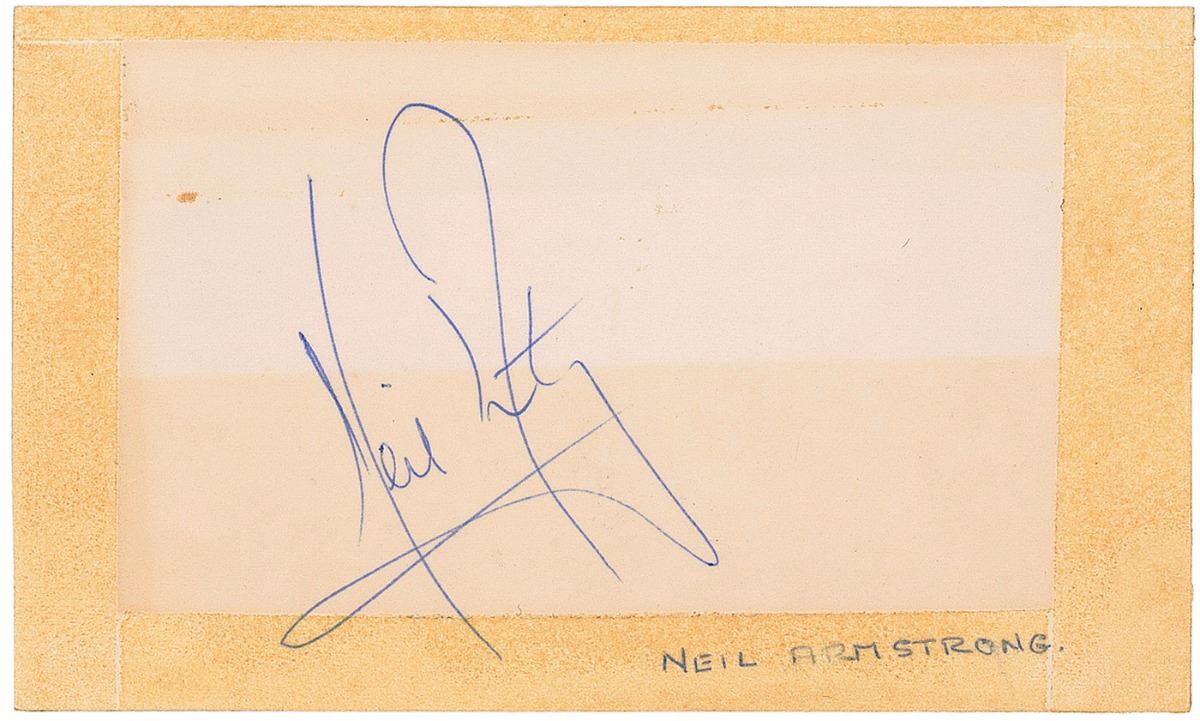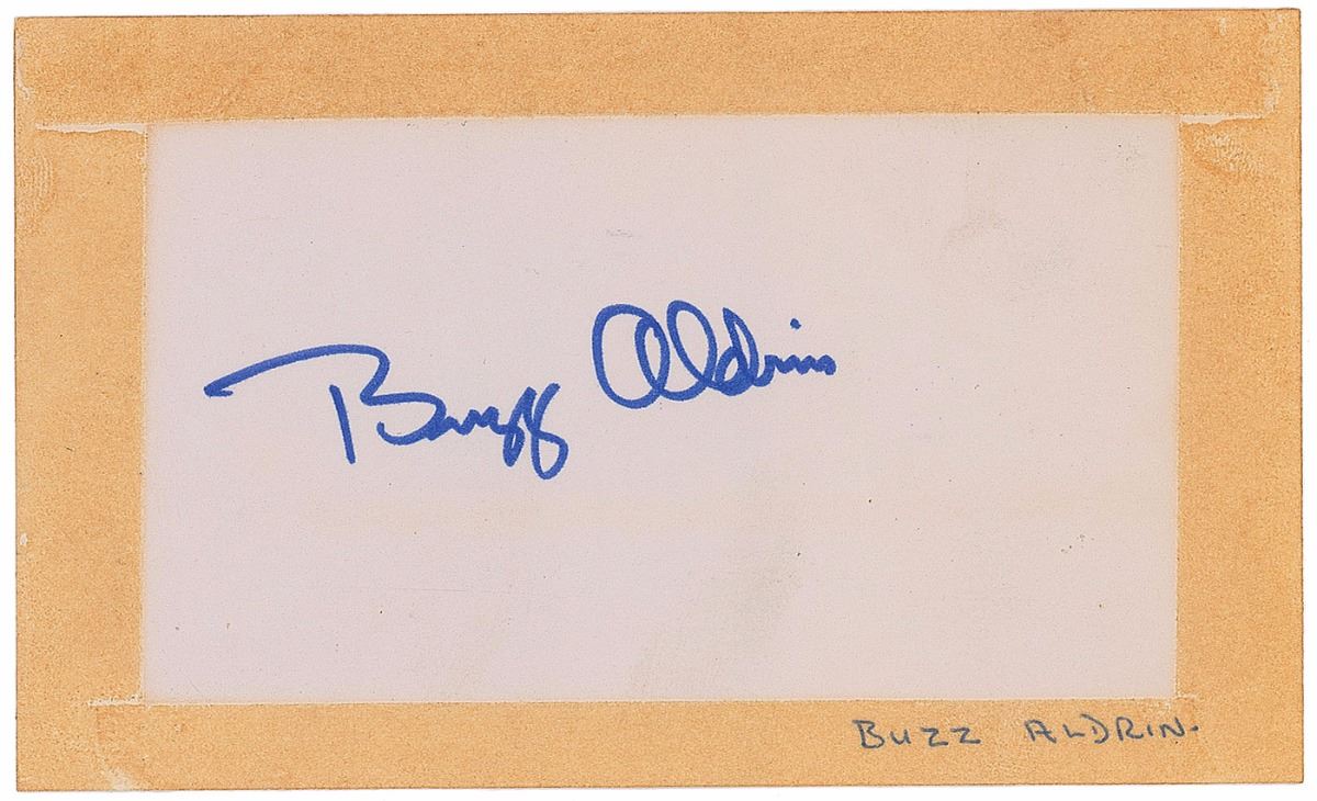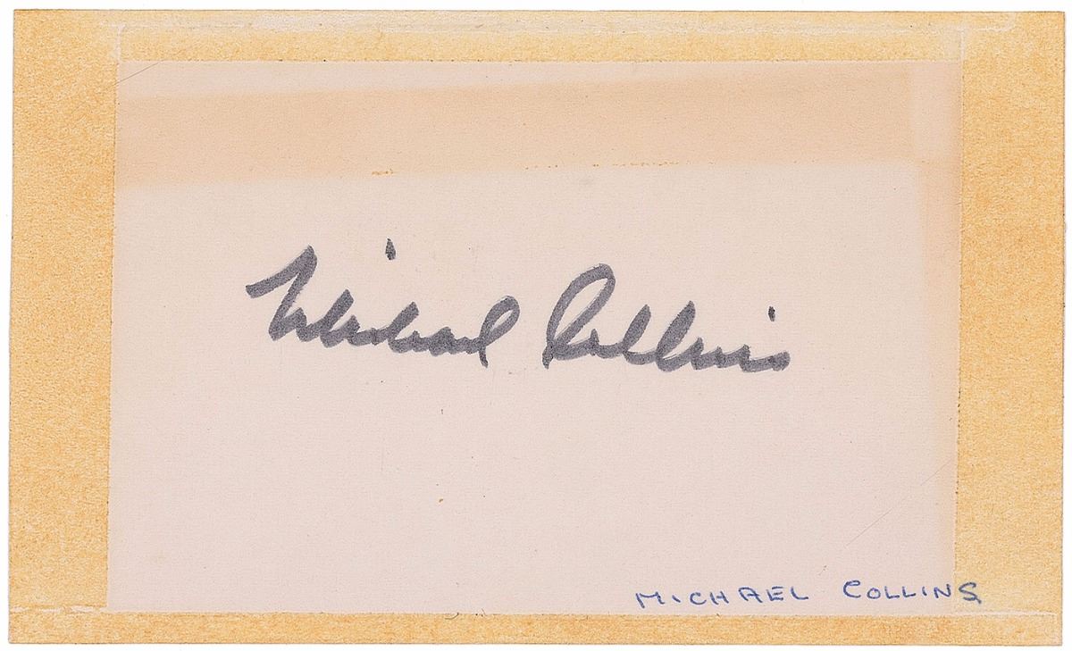 Complete set of uninscribed felt tip and ballpoint signatures, “Neil Armstrong,” “Buzz Aldrin,” and “Michael Collins,” on individual off-white 5 x 3 cards. Toned adhesive remnants to edges of all cards and lighter bands of toning to the Collins and Armstrong cards otherwise overall fine condition.