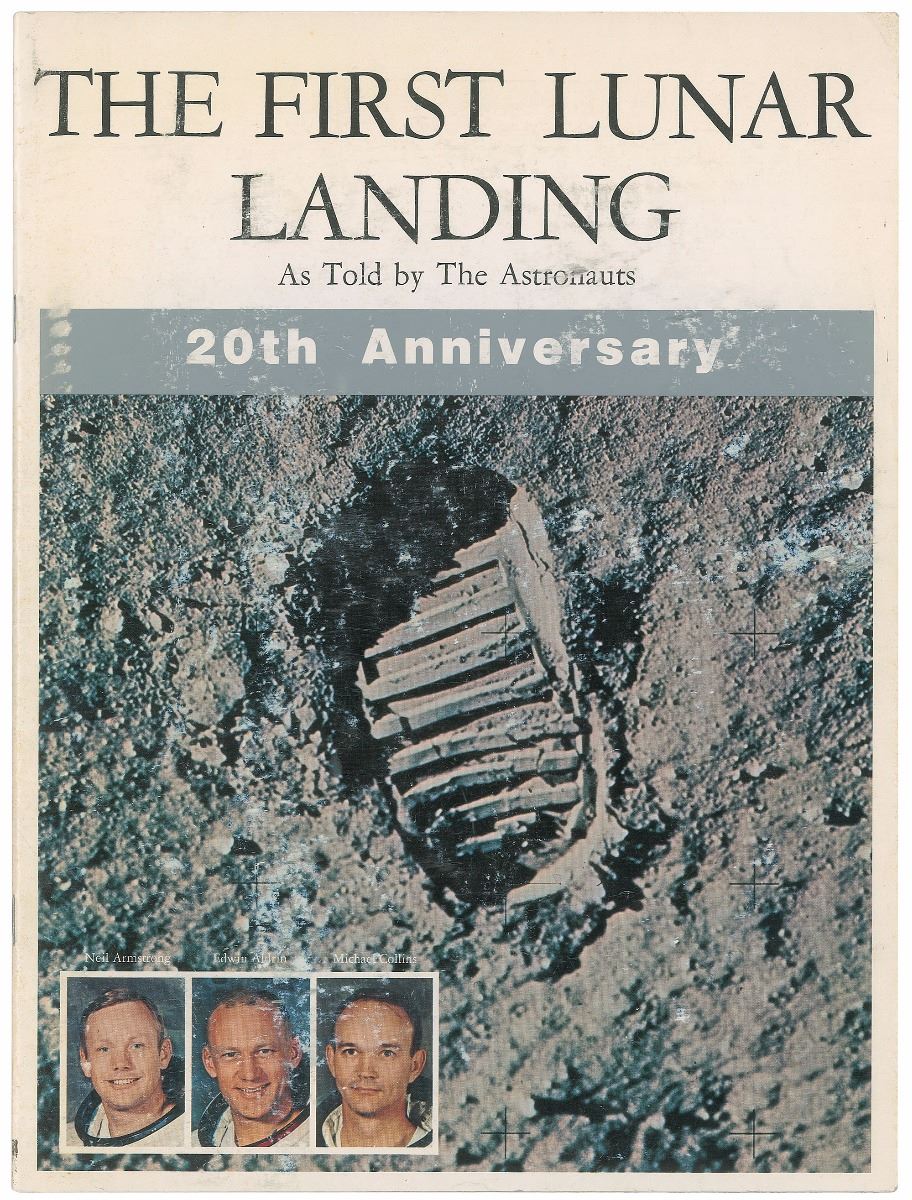 Commemorative program entitled “The First Lunar Landing: As Told by The Astronauts,” celebrating the 20th anniversary of the event, 9 x 12, 24 pages, signed on the back cover in black ink by Neil Armstrong, Buzz Aldrin, and Michael Collins. In very good to fine condition. NASA’s Office of Public Affairs capitalized on the achievements of the successful Apollo 11 mission by releasing this commemorative program that transcribed a post-flight press conference held by Armstrong, Aldrin, and Collins.