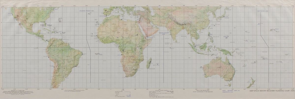 Attractive color third edition of the Apollo 11 Deep Space Reentry Recovery Planning Chart, 41.25 x 13.5, dated June 17, 1969, displaying recovery lines for the Atlantic, Indian, and Mid Pacific oceans, as well as airfields and tracking stations. Lithographed by ACIC 6–69, and prepared under the direction of the Department of Defense by the Aeronautical Chart and Information Center. Rolled and in fine condition, with general light handling wear.