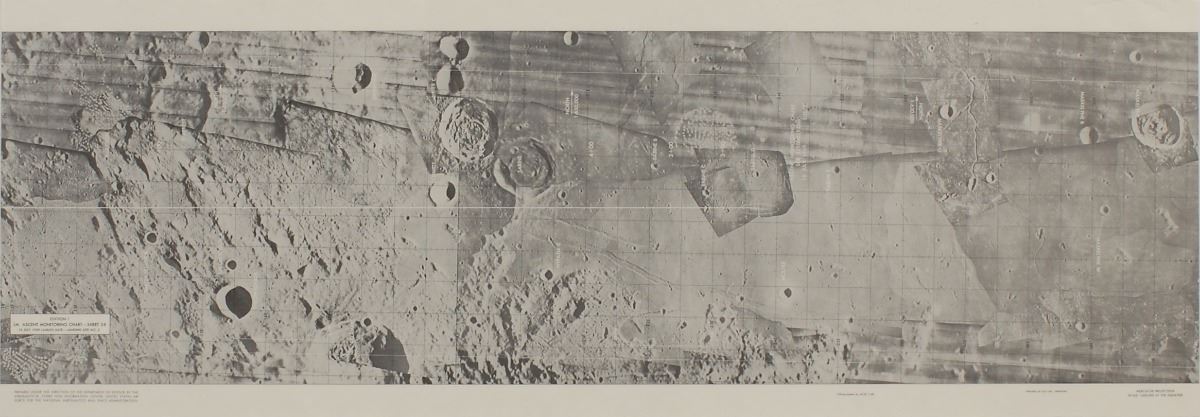 First edition of the Apollo 11 Lunar Module Ascent Monitoring Chart, sheet No. 3B, 35.75 x 12.5, displaying the lunar terrain designated as landing site No. 2, listing craters like Theon Senior (A and B), Dionysius (A), Ritter (C), Sabine (B, C, D, and E), Schmidt, and Delambre. Lithographed by ACIC 7–69, and prepared under the direction of the Department of Defense by the Aeronautical Chart and Information Center. Rolled and in fine condition, with general light handling wear.