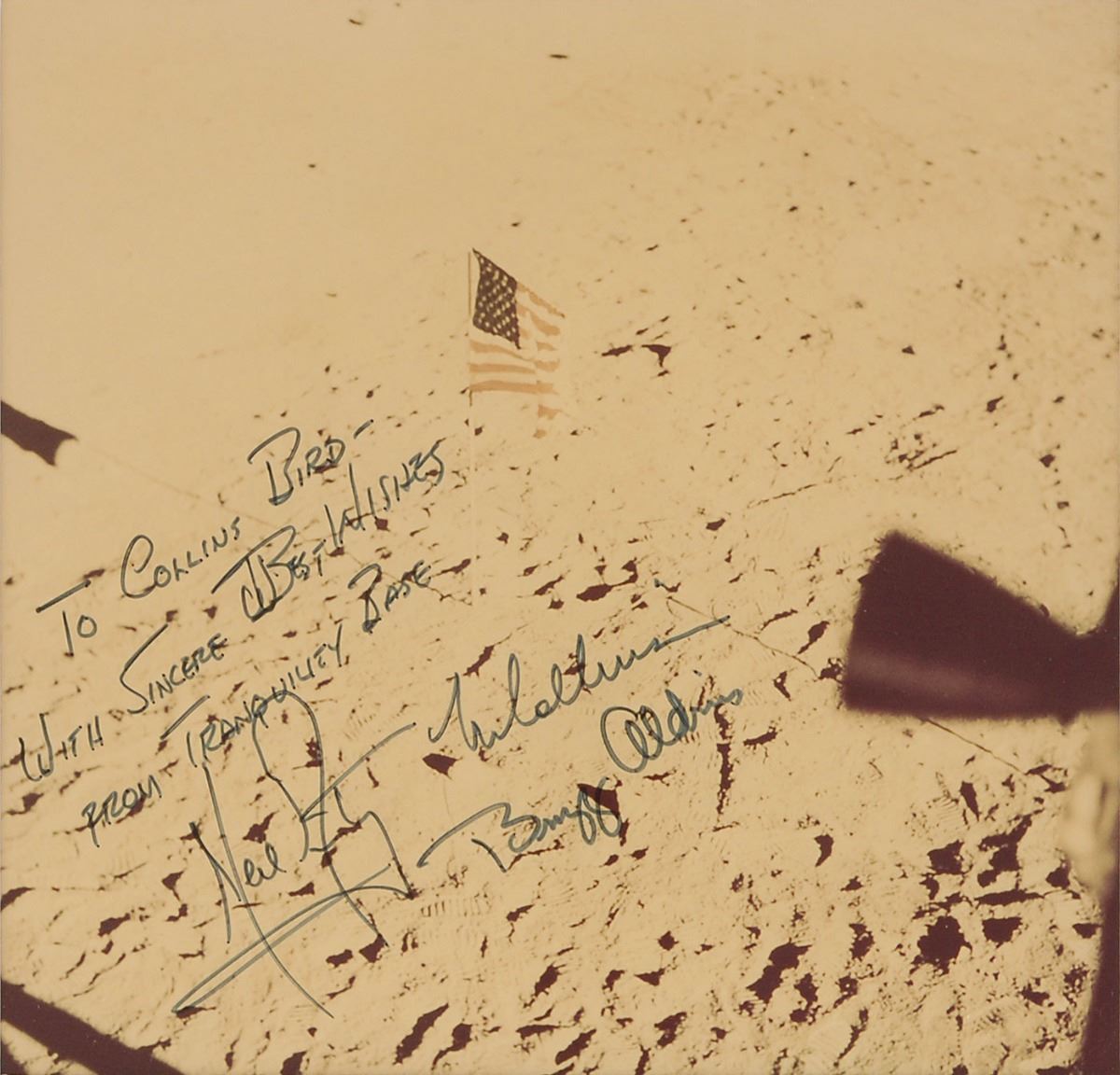 Magnificent color satin-finish 7.25 x 7 photo of the American flag planted on the lunar surface after man’s first moon landing, signed and inscribed in black felt tip, “To Collins Bird—With Sincere Best Wishes from Tranquility Base, Neil Armstrong,” “Buzz Aldrin,” and “M. Collins.” Matted and framed. In fine condition. Collins Bird owned the Georgetown Inn on Wisconsin Avenue in Washington, DC, which was where astronauts and NASA officials usually stayed when they visited the city; Bird and his hotel are mentioned in James Lovell’s book Lost Moon. A rarely seen, exceptionally desirable fully signed Apollo 11 photo.