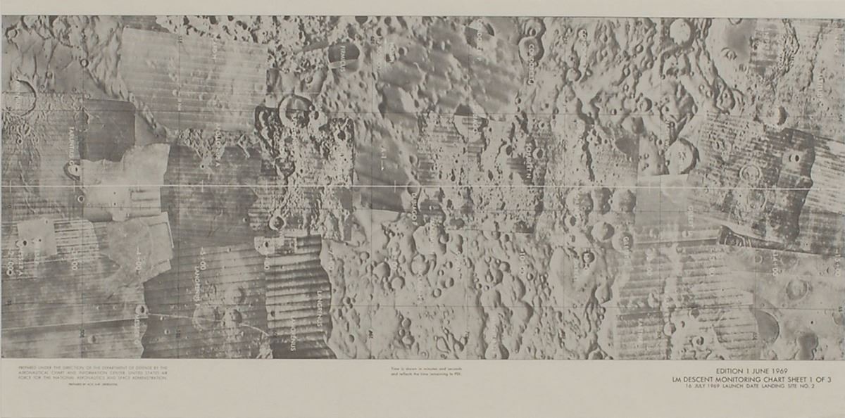 First edition of the Apollo 11 Lunar Module Descent Monitoring Chart, sheet No. 1 of 3, 21 x 10.5, displaying the lunar terrain designated as landing site No. 2, listing craters like Banachiewicz, Jansky, Gilbert, Dubiago, and Langrenus. Lithographed by ACIC 6–69, and prepared under the direction of the Department of Defense by the Aeronautical Chart and Information Center. Rolled and in fine condition, with general light handling wear.