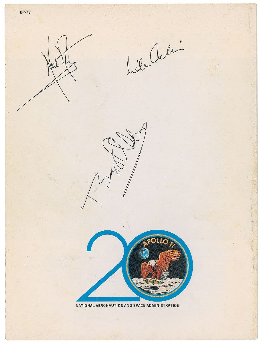 Commemorative program entitled “The First Lunar Landing: As Told by The Astronauts,” celebrating the 20th anniversary of the event, 9 x 12, 24 pages, signed on the back cover in black ink by Neil Armstrong, Buzz Aldrin, and Michael Collins. In very good to fine condition. NASA’s Office of Public Affairs capitalized on the achievements of the successful Apollo 11 mission by releasing this commemorative program that transcribed a post-flight press conference held by Armstrong, Aldrin, and Collins.