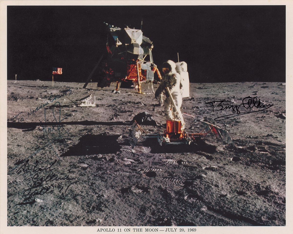 Official color 10 x 8 NASA lithograph of Buzz Aldrin working on the lunar surface, signed and inscribed in black felt tip, “To Norman Graves, Neil Armstrong,” and signed in black felt tip, “Buzz Aldrin” and “Michael Collins, Apollo 11.” In fine condition, with some fair contrast to the signatures. A superb photo that showcases Aldrin in his spacesuit, the lunar module and American flag, and several lunar footprints—a combination rarely found signed by the entire crew.