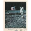 Scarce official color 11 x 14 NASA lithograph of Aldrin standing with the US flag at Tranquility Base, signed and inscribed in the lower border in black felt tip “To John Ryan, with best wishes, Buzz Aldrin,” “Neil Armstrong,” and “M. Collins.” Mounted to a same-size sheet of heavy cardstock and in very good to fine condition, with lightly trimmed edges, two small areas of rippling from aforementioned mounting, and a slightly blurry quality to the inscription.