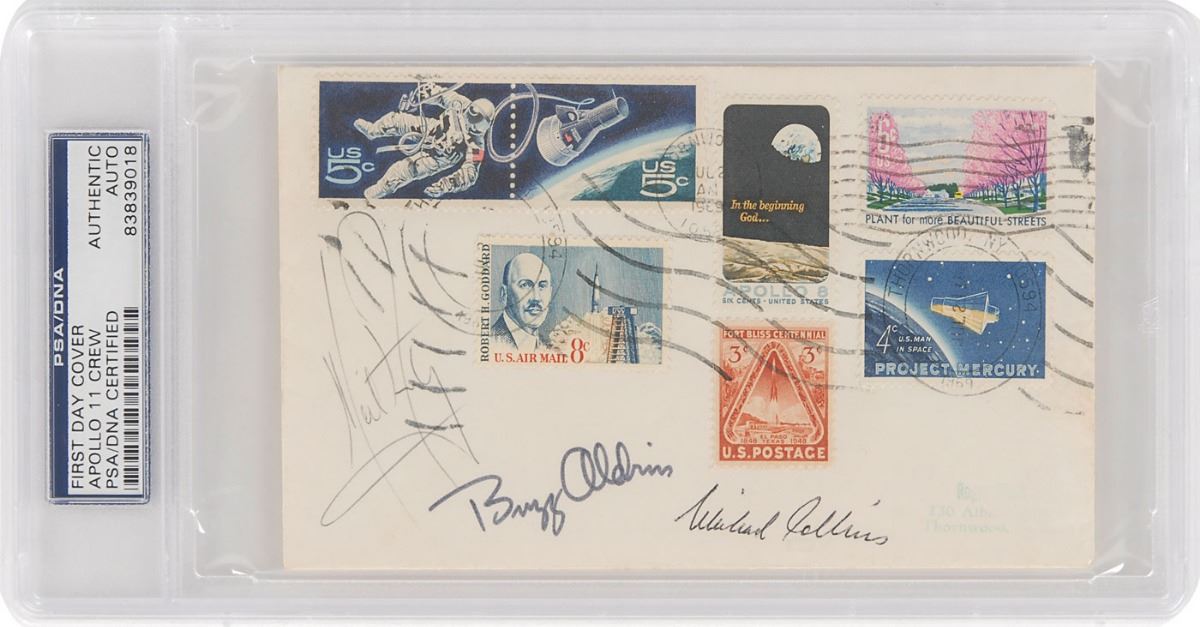 Cover featuring a number of affixed stamps honoring milestones of flight, signed in black ink by Neil Armstrong, Buzz Aldrin, and Michael Collins. Encapsulated in a plastic PSA/DNA authentication holder. In fine condition.