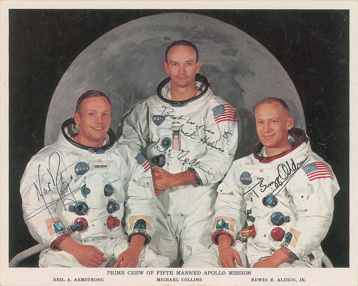 Highly sought-after color 10 x 8 NASA lithograph of the complete Apollo 11 prime crew in their white space suits, signed and inscribed in black felt tip, “Best wishes to Nick Hanes, Mike Collins,” “Neil Armstrong,” and “Buzz Aldrin.” In very good to fine condition, with a bit of light creasing, and a light vertical bend passing between Collins and Aldrin.