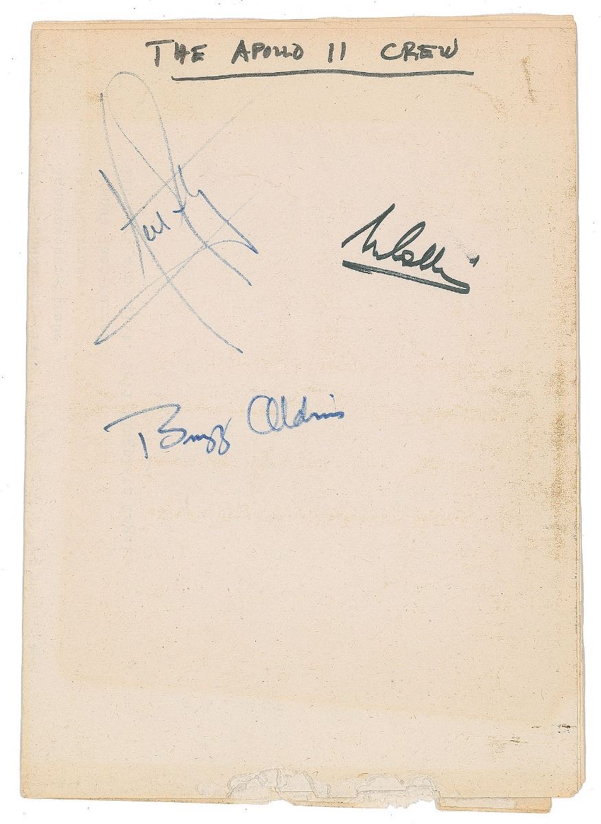 Felt tip signatures, “Neil Armstrong,” “M. Collins,” and “Buzz Aldrin,” who adds at the top, “The Apollo 11 Crew,” on the reverse of a German itinerary packet related to the worldwide goodwill tour following the successful Apollo 11 moon-landing, with the signed portion measuring 6 x 8.25. In very good to fine condition, with a light vertical bend, and scattered light toning and creasing.