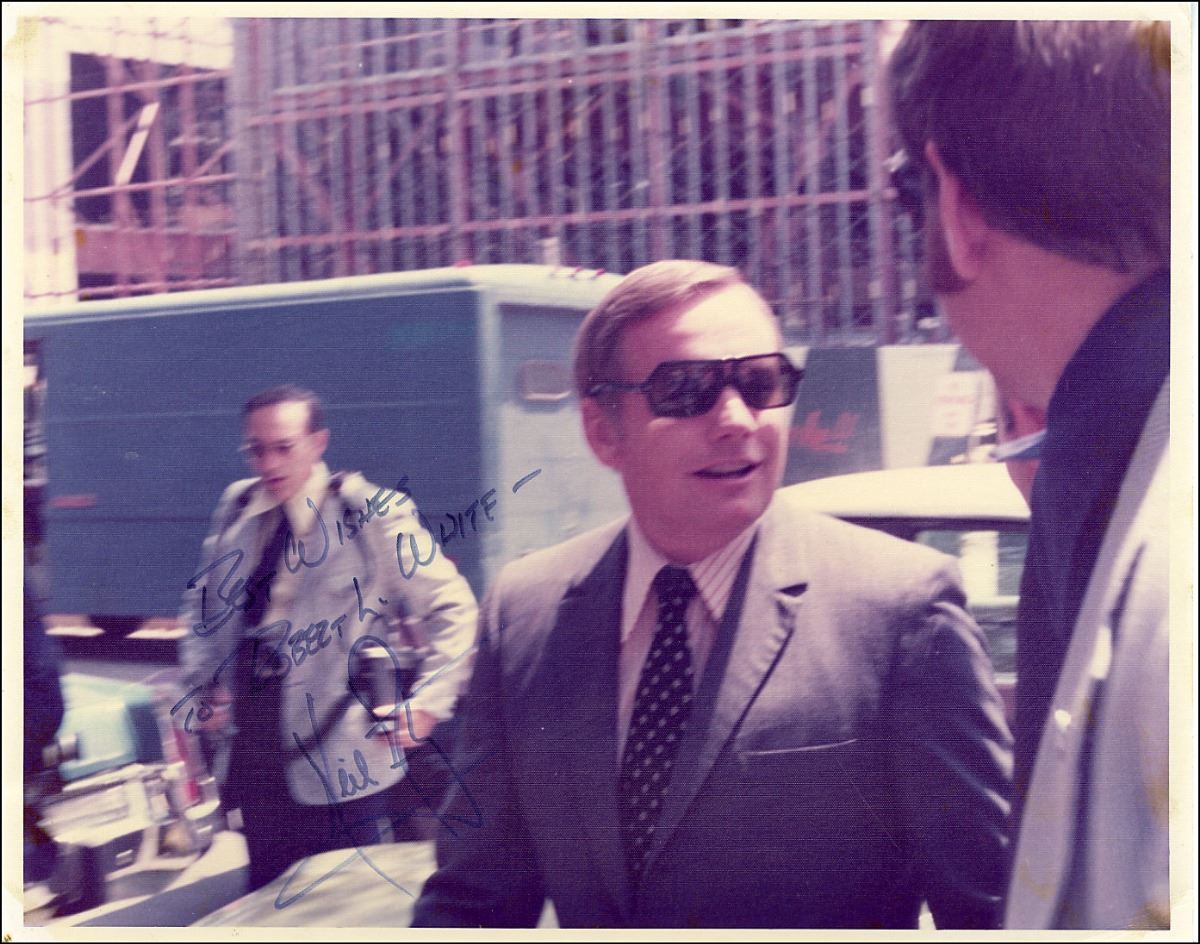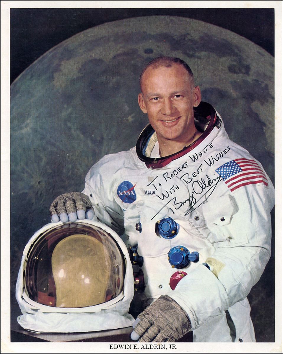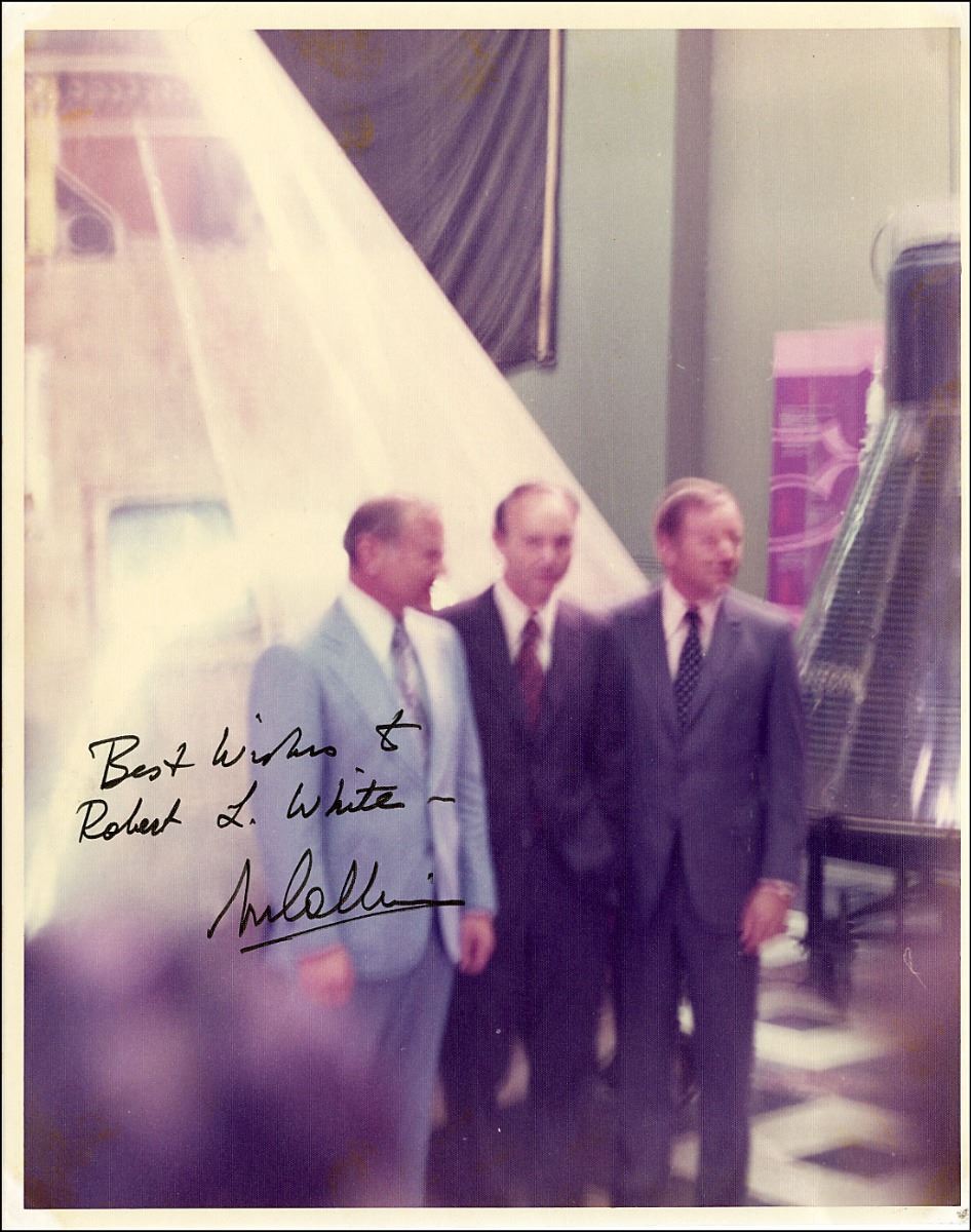 Three signed photos individually signed in black felt tip by an Apollo 11 astronaut, each inscribed to noted Kennedy collector Robert White, including: a color textured matte-finish 10 x 8 candid photo of Neil Armstrong taken in Washington in 1975 on the fifth anniversary of the Apollo mission, signed by Armstrong; a color textured matte-finish 8 x 10 photo of the Apollo 11 crew members posing in front of their command module on the fifth anniversary, signed by Michael Collins; and an official color 8 x 10 NASA lithograph of Buzz Aldrin in his space suit, signed by Aldrin. In overall fine condition, with the candid photos somewhat shaky and out of focus. Pre-certified Zarelli Space Authentication.