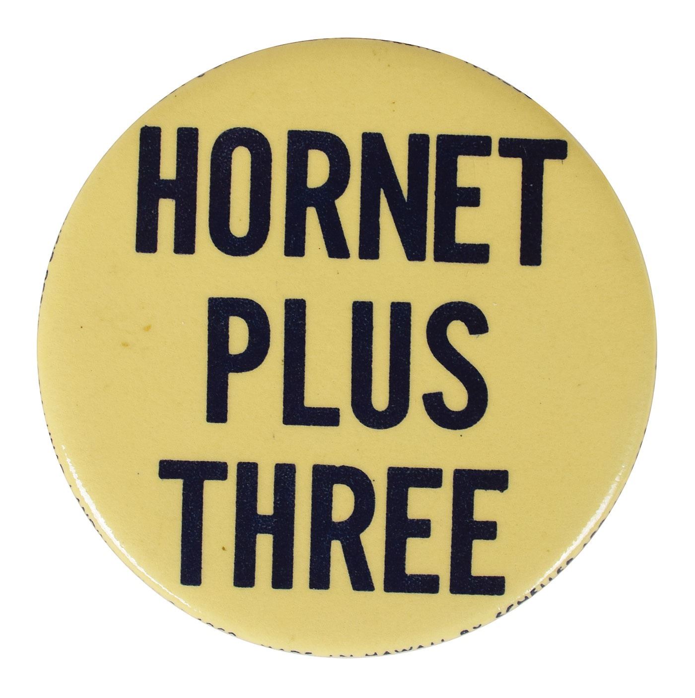 Extremely rare Apollo 11 "Hornet Plus Three" button, measuring 2.25? in diameter, featuring deep navy blue text on an ivory-colored background. Text around the rim reads: "Official button worn by the 3 astronauts on their return from lunar landing, July 24, 1969, made in Hawaii by Scheller Apoian Specialties." In fine condition. Consignor notes that he originally purchased this from noted JFK collector Robert L. White. The Apollo 11 astronauts wore a version of this button that lacked the first part of the text on the rim, and this variation was created at the same time that Scheller Apoian Specialties produced the buttons that Apollo 12 wore upon being picked up by the USS Hornet, which read, 'Hornet, Three More Like Before, Apollo 12.' These Apollo 11 "Hornet Plus Three" are very rare buttons, and were likely released as part of a press informational packet.