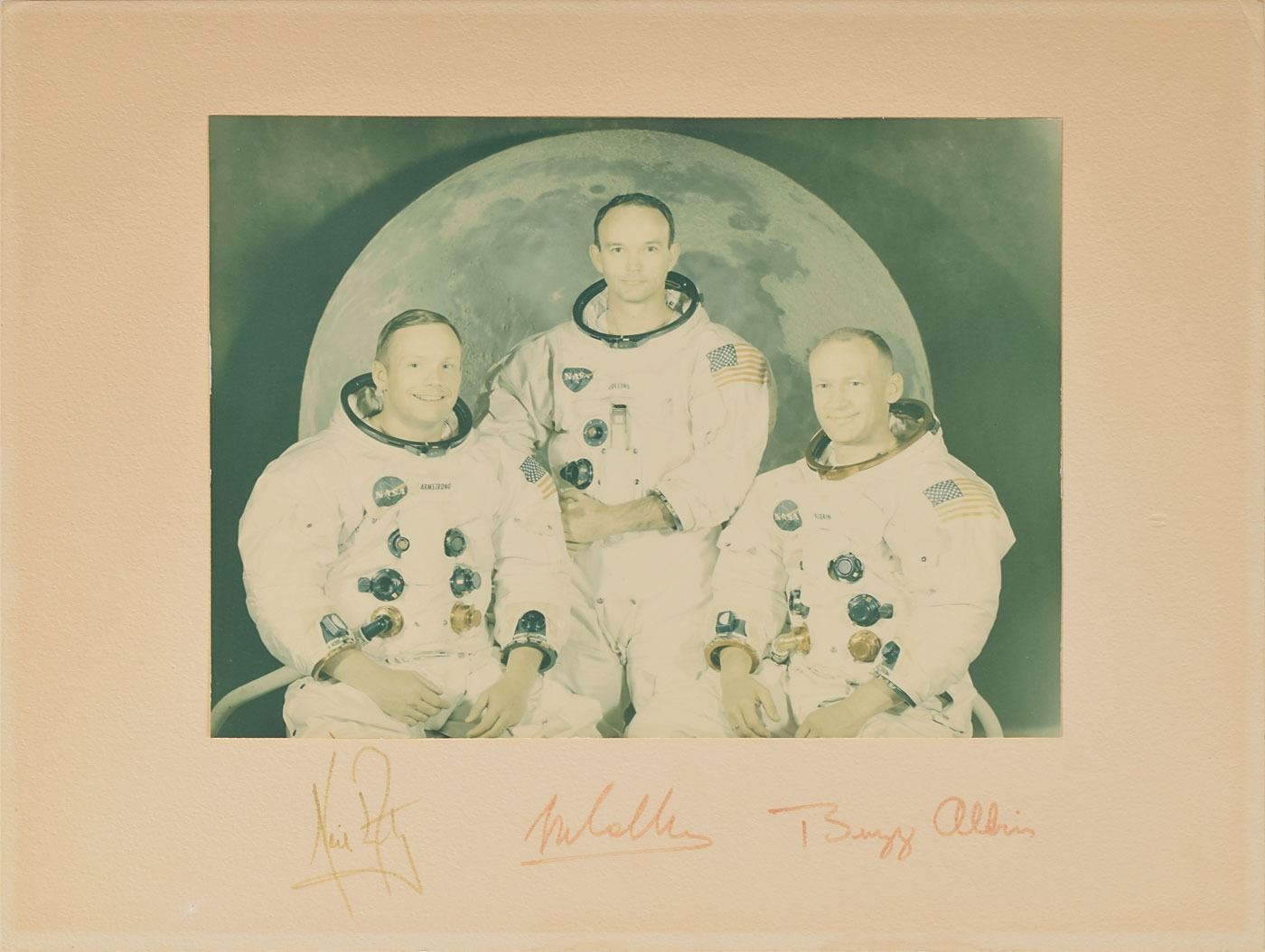 Vintage color glossy 9.5 x 7.25 photo of the crew of Apollo 11 posing in their white space suits against a large lunar backdrop, affixed to the original 14 x 11 mount, signed on the mount in black felt tip, "Neil Armstrong," "M. Collins," and "Buzz Aldrin." In fine condition, with a light block of toning from prior display, and fading to the image and the signatures.